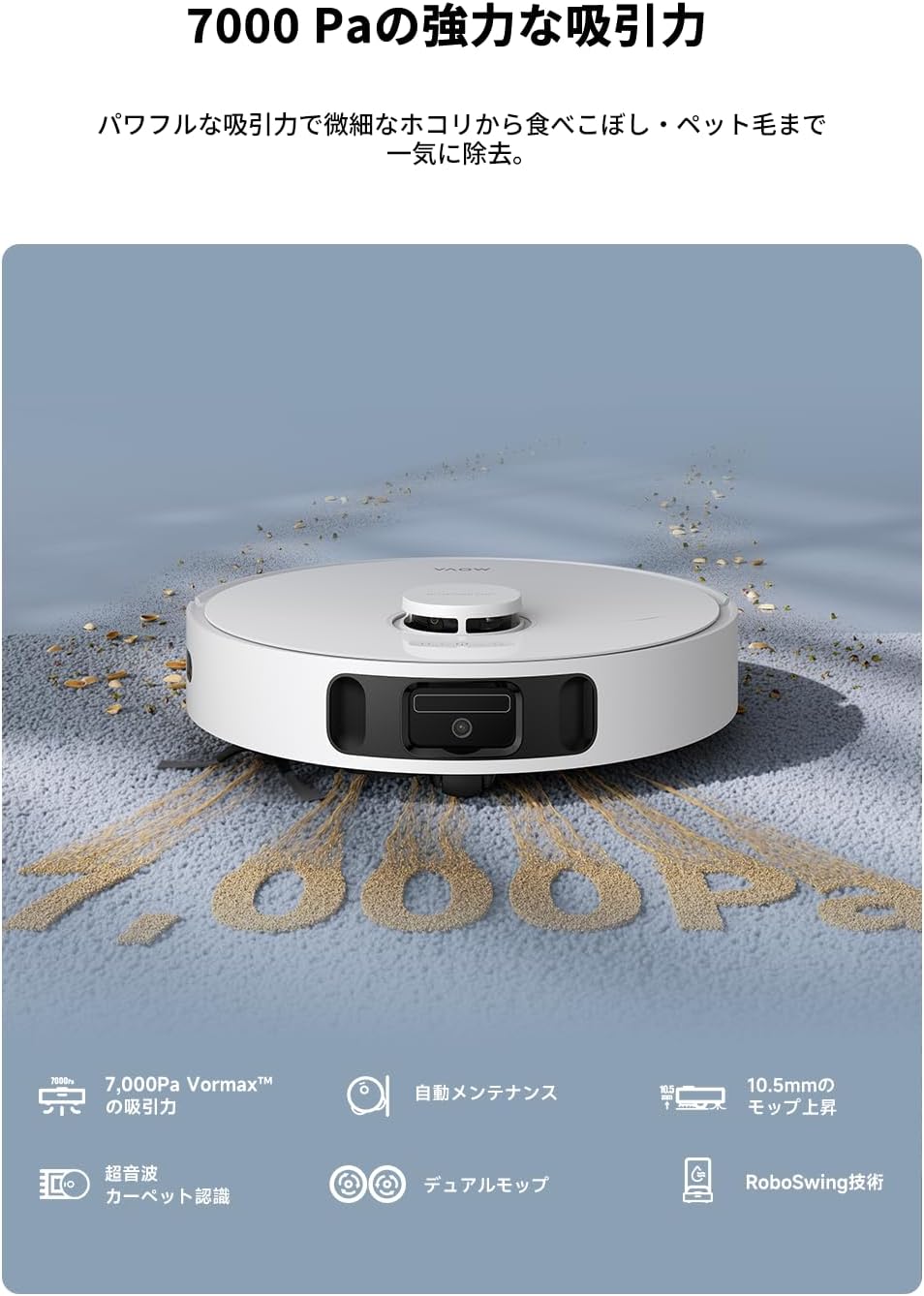 MOVA E30 Ultraにはペット特化の吸引設計が施されており、繊維に絡みやすい毛を効率的に回収する機能を備えています。