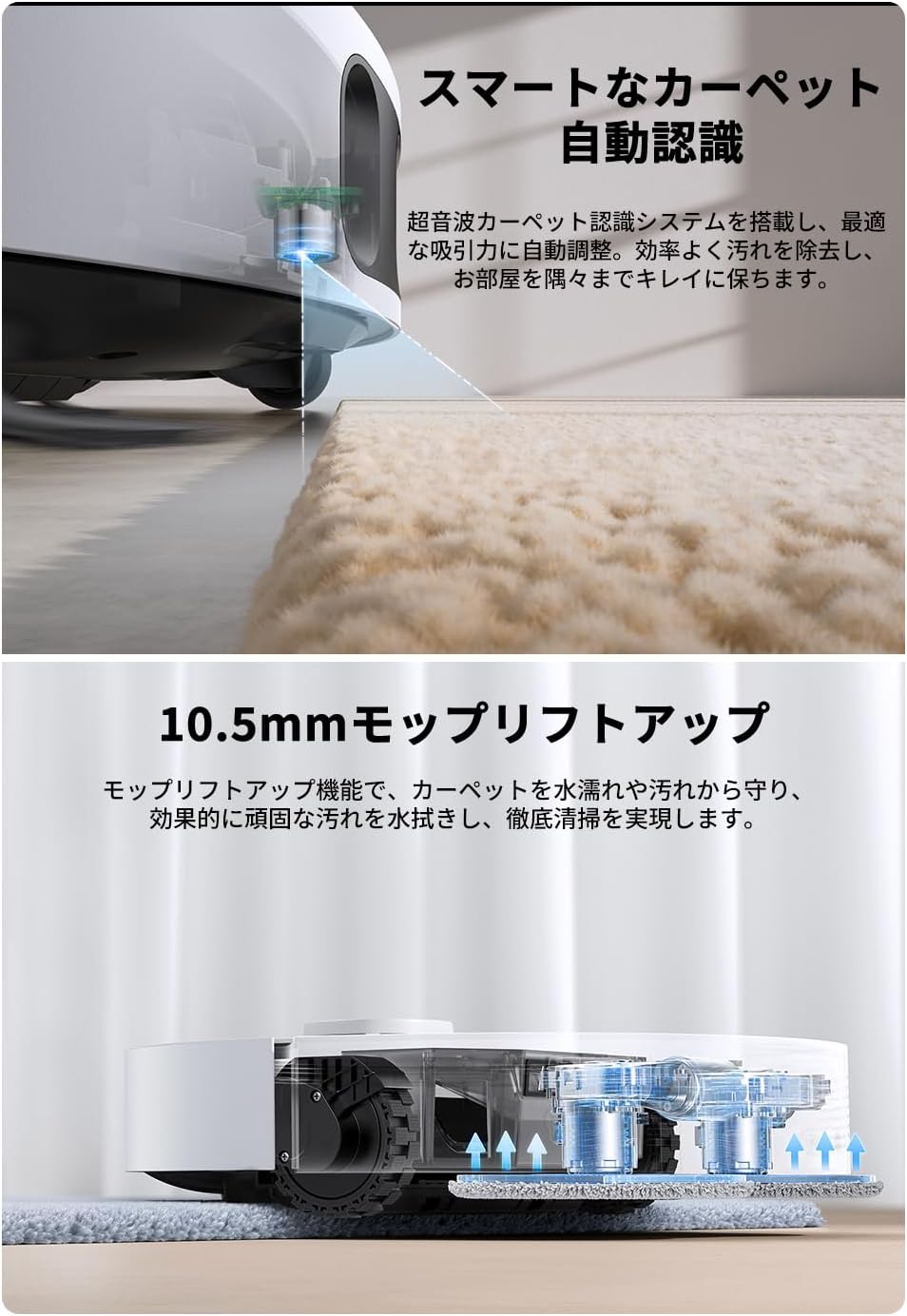 吸引だけでなく水拭きまで自動化し、さらにモップを自動で洗浄・乾燥してくれる点が、このモデルの大きな魅力です。