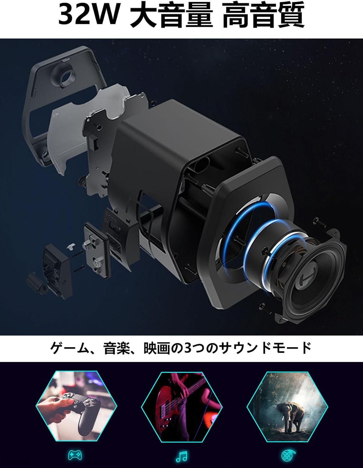 「ゲームモード」「映画モード」「音楽モード」の3つのEQプリセットは、単なるおまけ機能ではありません。ゲームモードでは足音や銃声の定位を強調し、映画モードではセリフの明瞭さと低音の広がりを強化します。ボタン一つでスピーカーの性格がガラリと変わり、あらゆるエンターテインメントに最適化された音響空間を提供します 。