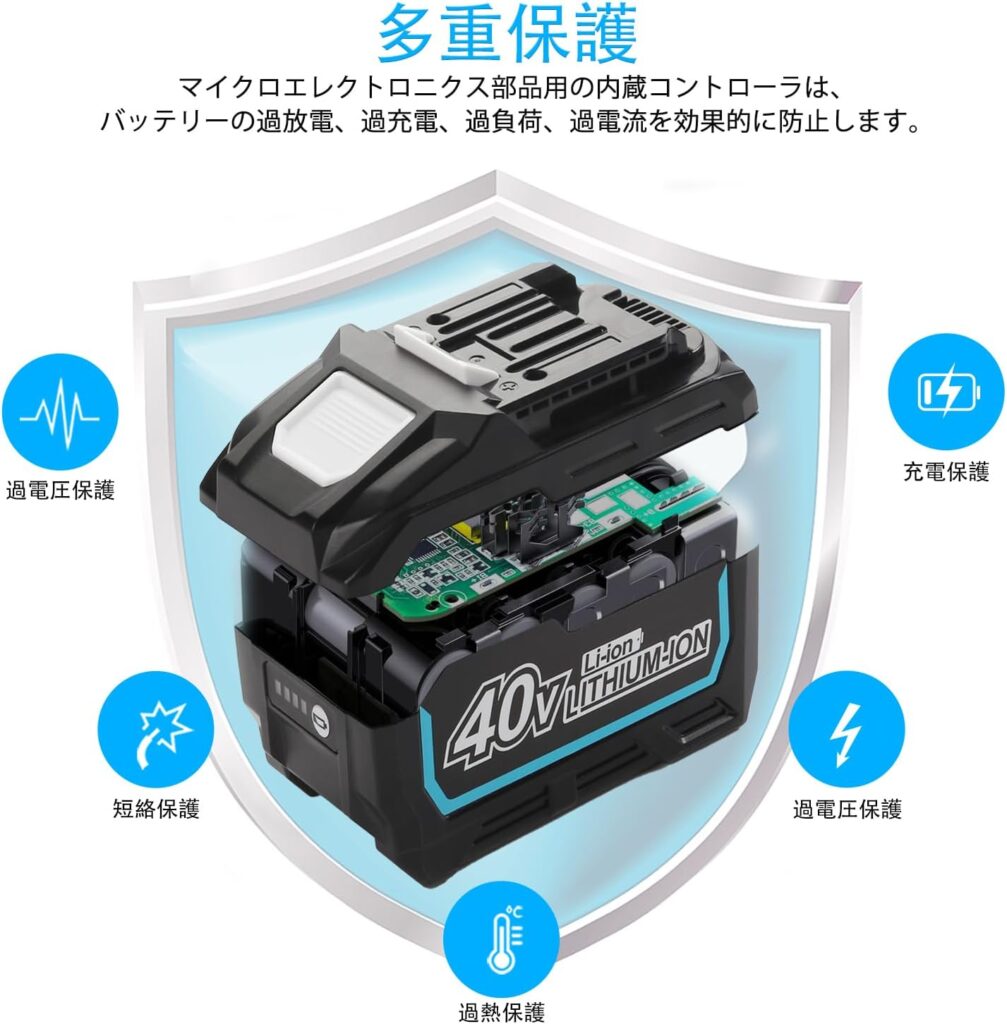 マキタの40Vmaxシリーズは、バッテリーと工具、充電器がデジタル通信を行い、最適なパワー供給と充電管理を行っています。純正品はこのシステムが完璧に機能し、過負荷や過放電からセルを守ります。