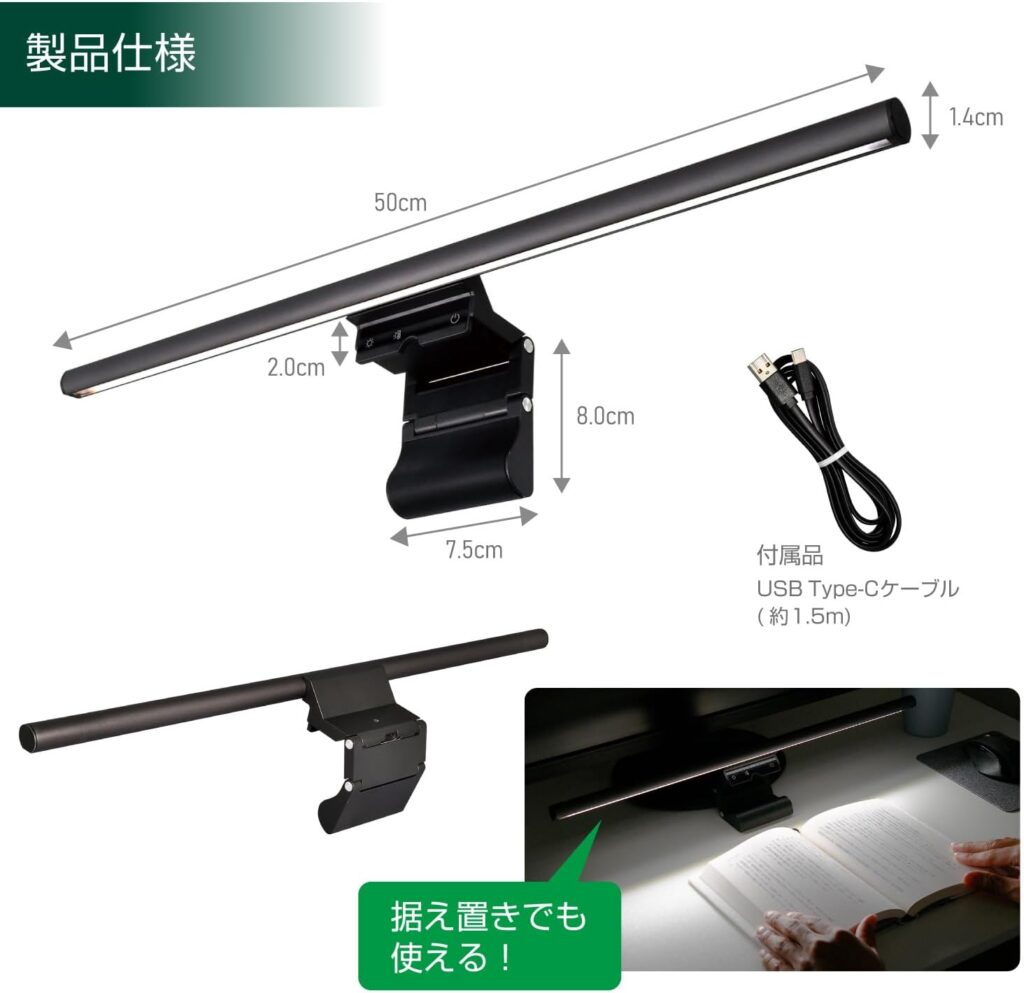 モニターライトの最大の価値は、単にデスクを照らすことではありません。この製品の真髄は、光がPCモニターに反射せず、手元の作業スペースだけを的確に照らす「非対称配光」設計にあります。これにより、画面の映り込みによるストレスや、それに伴う眼精疲労から解放されます。それはまるで、あなた専用のコックピットを手に入れるような感覚です。幅50cmというワイドな設計は、A3サイズの資料を広げても端から端まで均一な光を届け、あなたの集中力を最大限に引き出します。 - 現代のデスク環境に最適化された「USB Type-C」給電