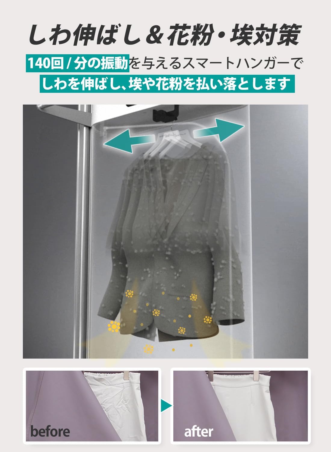 この商品の最大の魅力は、「設置工事不要で、どこでも『置ける』ではなく『掛けられる』」という革新的なポータビリティにあります。従来の衣類ケア家電は冷蔵庫のようなサイズ感が常識でしたが、本製品は本体重量約5.2kgと軽量で、クローゼットのポールやドアフックに吊るすだけで即座に使用可能です。​