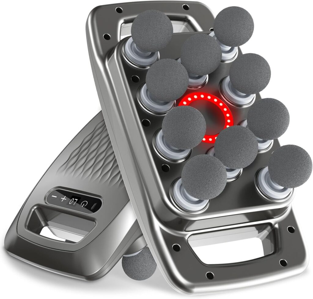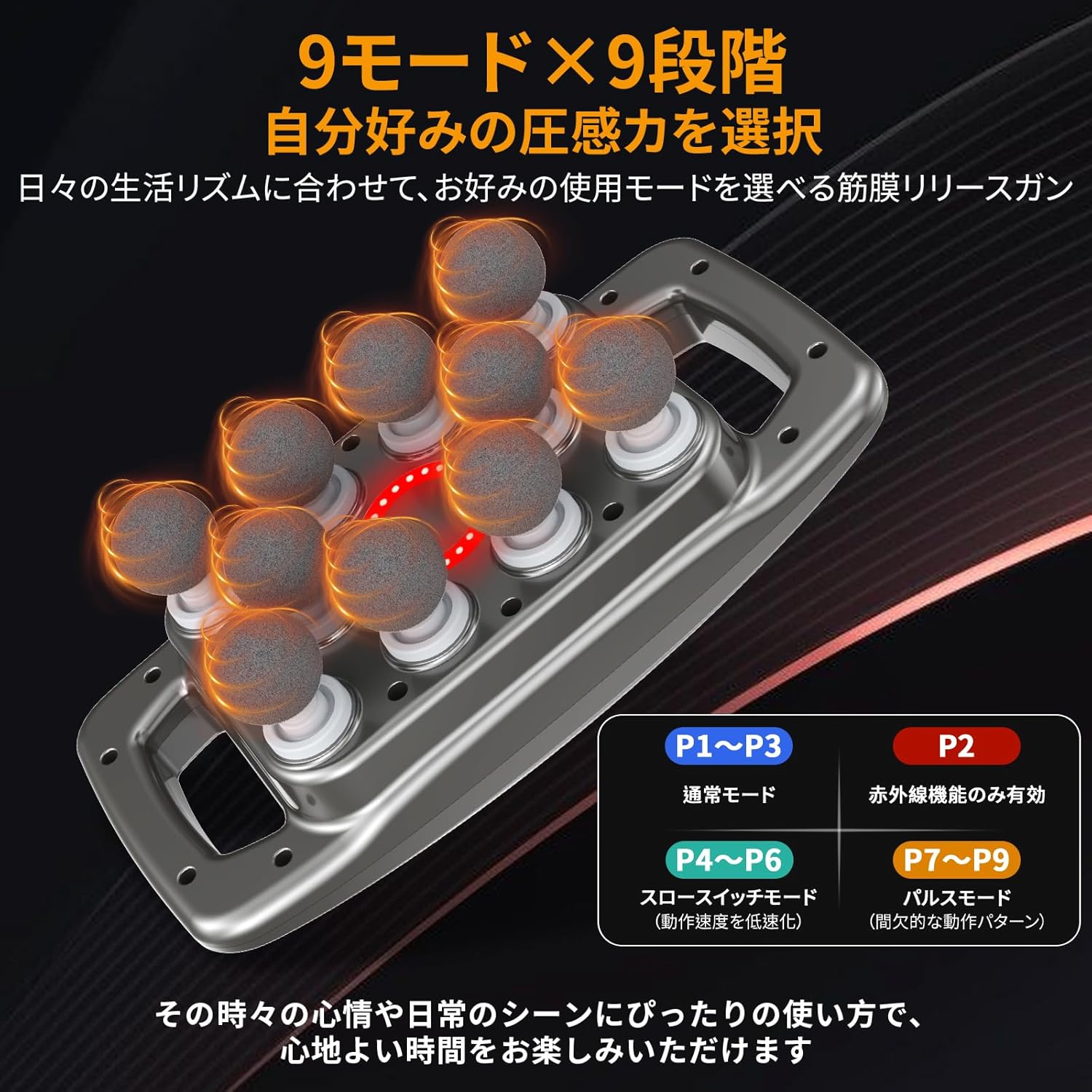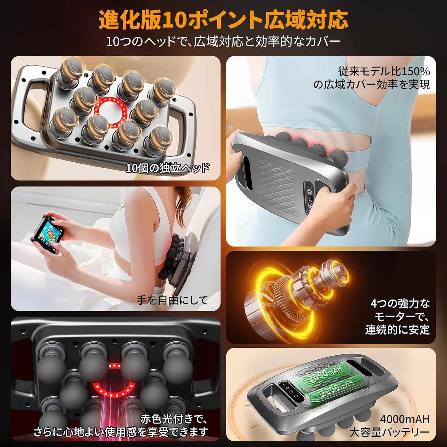 本製品の最大の魅力は、「類赤外線技術」と「10種類のヘッド」という、通常なら高級機にしか搭載されない機能を低価格で実現している点です。多くの安価なマッサージガンは単に「叩く」だけですが、このモデルは「温めながらケアする」というアプローチを取り入れています。これは、まるで蒸しタオルを当てながらマッサージを受けているようなリラックス効果をもたらします。また、10種類ものアタッチメントは、指圧のような「点」の刺激から、掌で包み込むような「面」の刺激まで、自宅にいながらプロの施術に近いバリエーションを再現可能です。