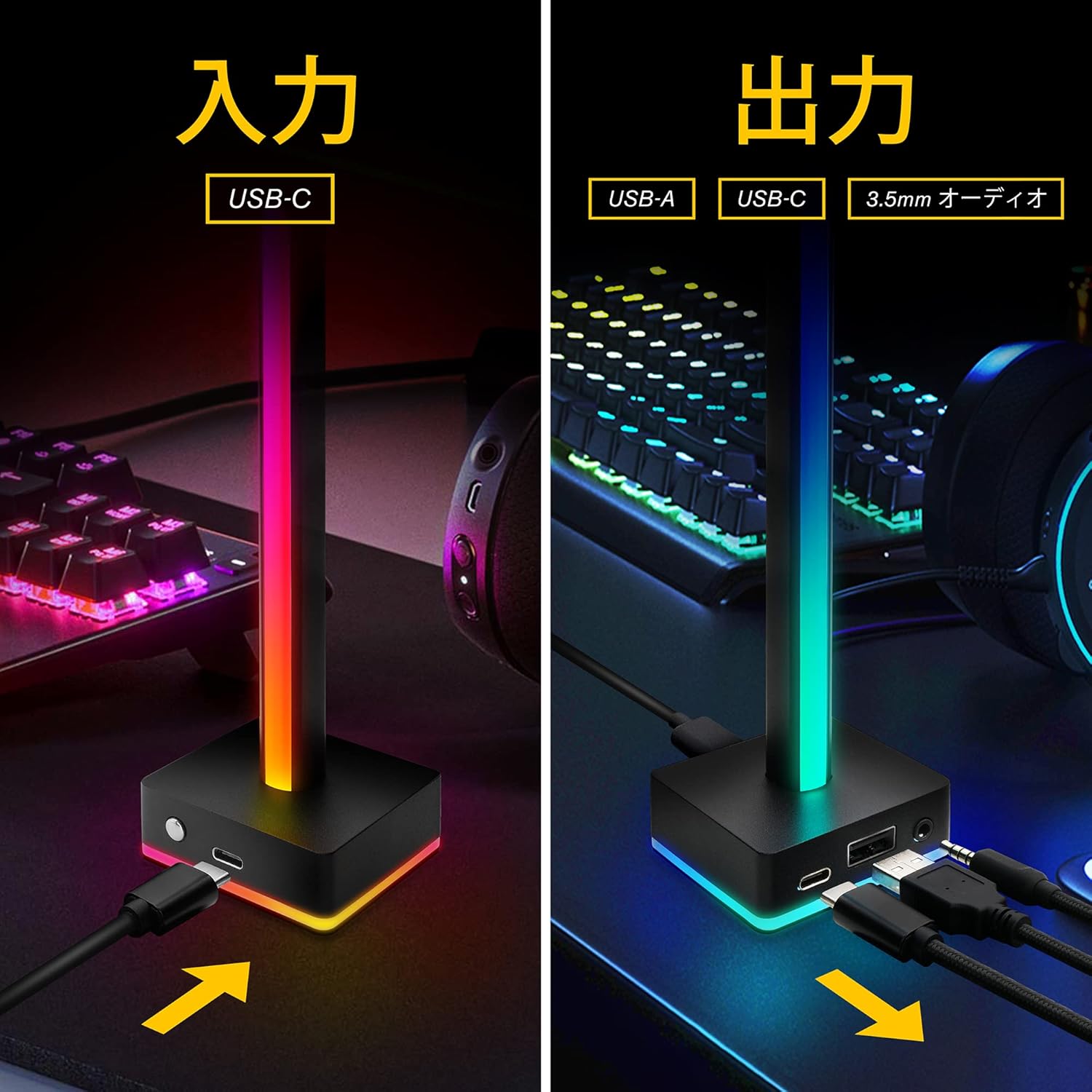 JP-ARGB Headset Standはライティング演出、AUXポート、USBハブ機能まで備えているため、「価格は数倍するが、得られる体験はそれ以上」という構図になります。