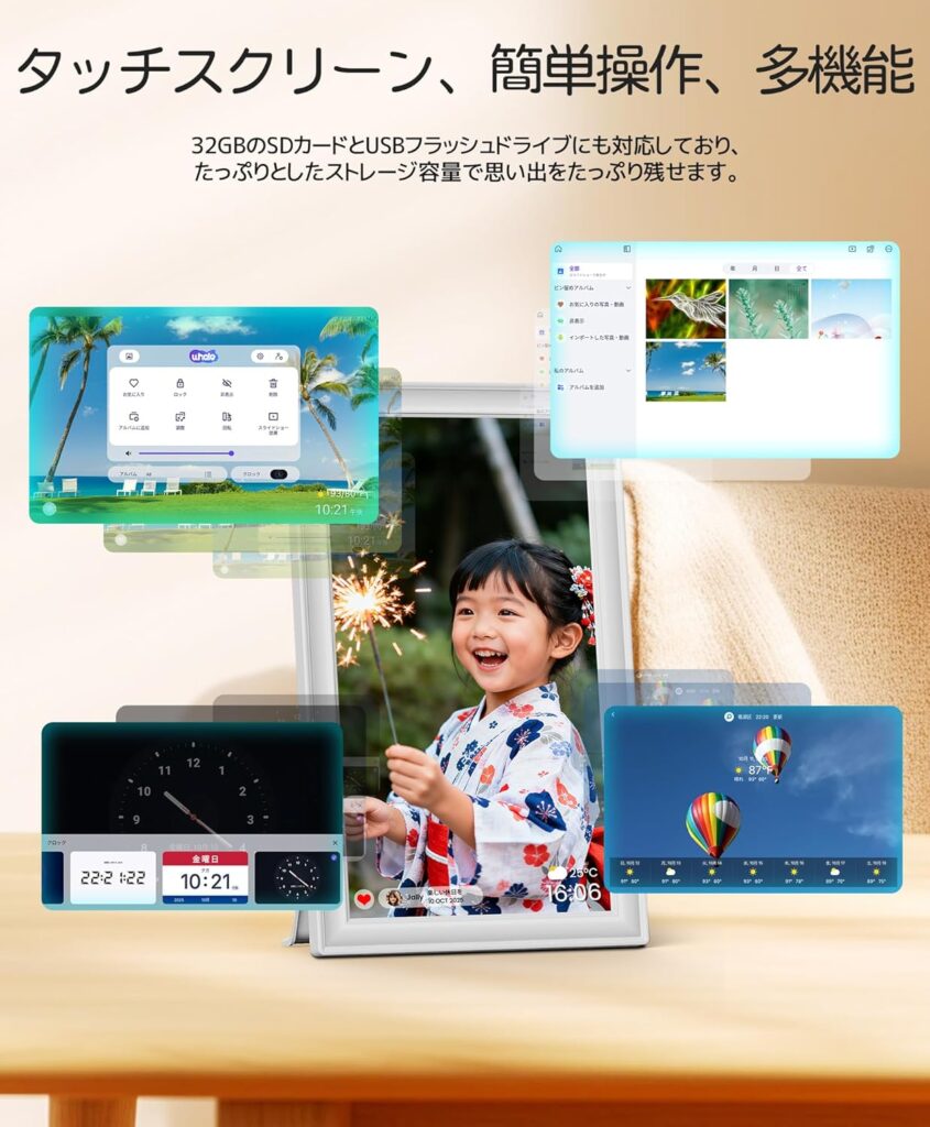 また、Wi-Fi接続機能を活かした専用アプリとの連携は、距離の壁を完全に取り払います。例えば、旅行先で撮影した写真をその場で実家のフレームへ転送する。そんなリアルタイムの体験共有が、複雑な操作なしで完結します。単なる表示装置ではなく、家族を笑顔にする「動くアルバム」としての完成度が非常に高い一台と言えます。
