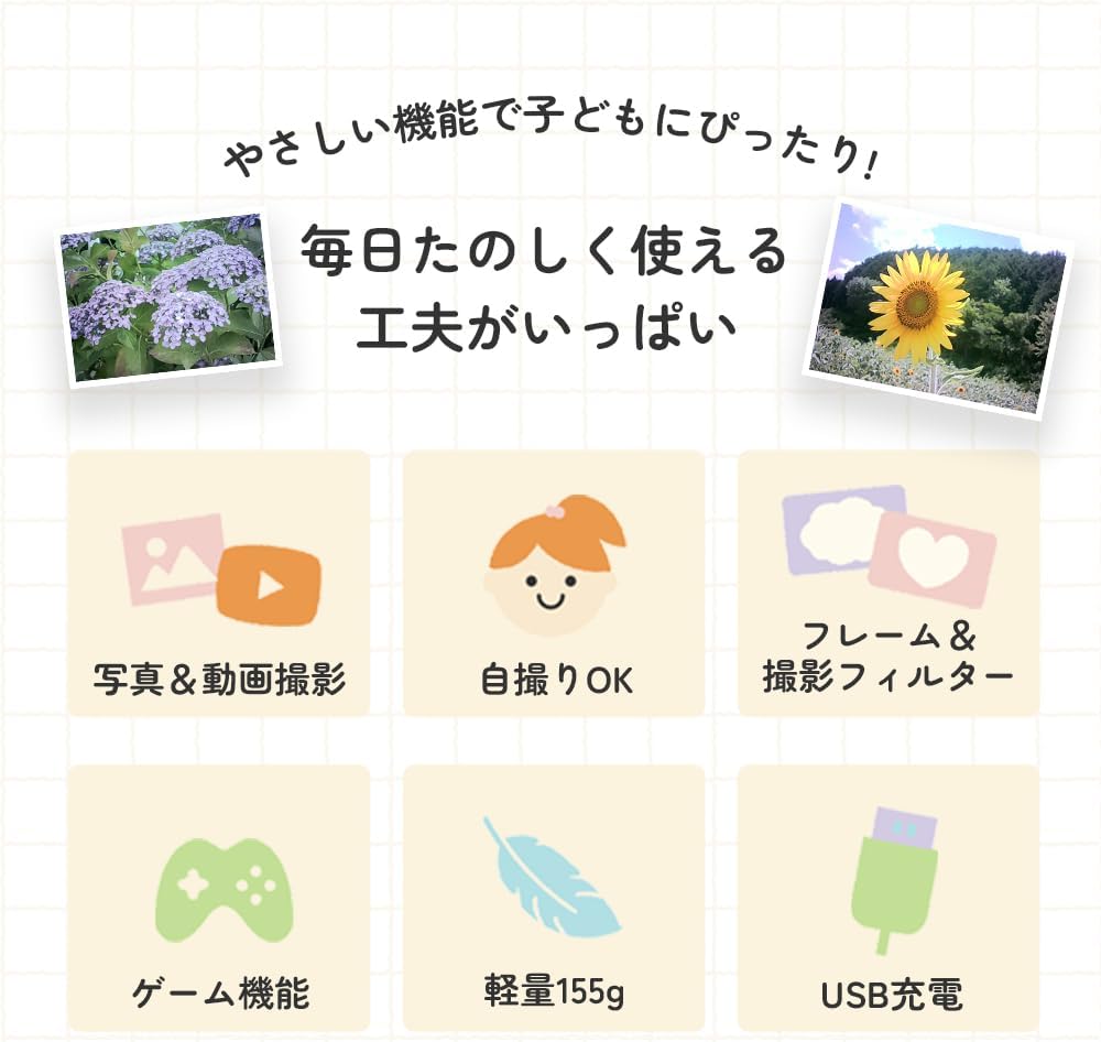 「カメラの操作が難しくてうまく撮れない」という子どもの挫折体験を防げる設計として、初めてのカメラとして子どもに持たせる選択肢として優れています。」