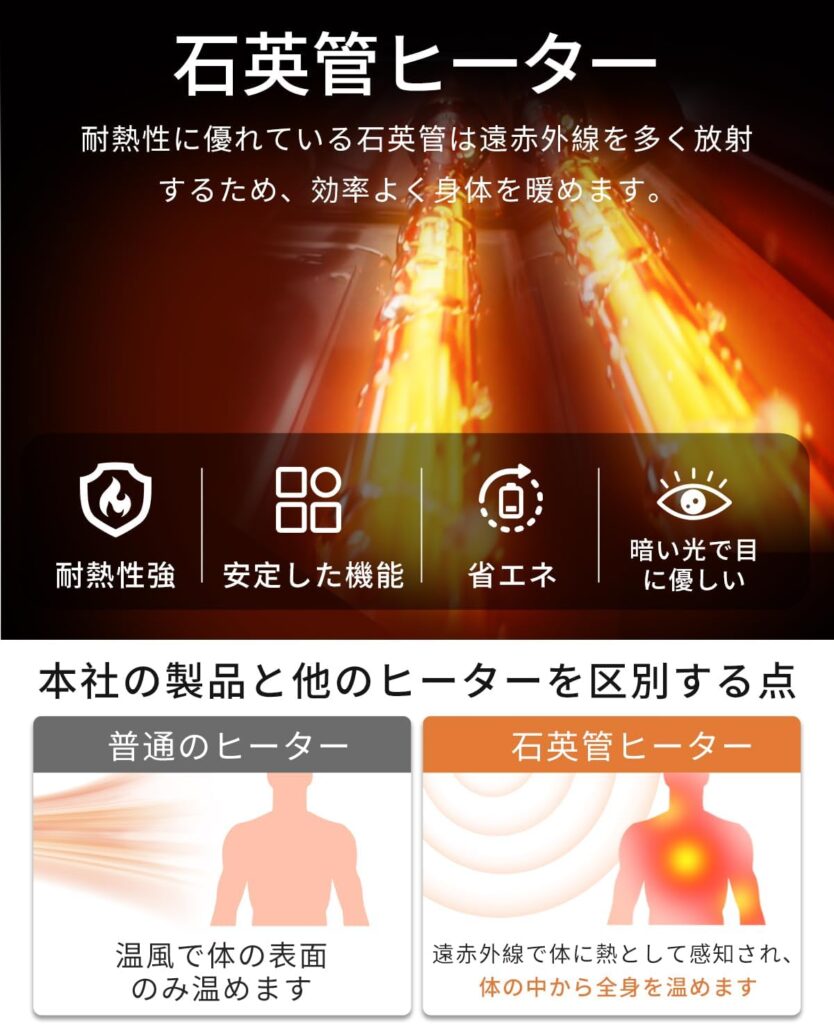 NSB-60Aは石英管ヒーターを使用しており、遠赤外線効果によって体の芯からじんわりと暖める特性があります。これは、風を送るタイプのセラミックファンヒーターとの決定的な違いを生みます。