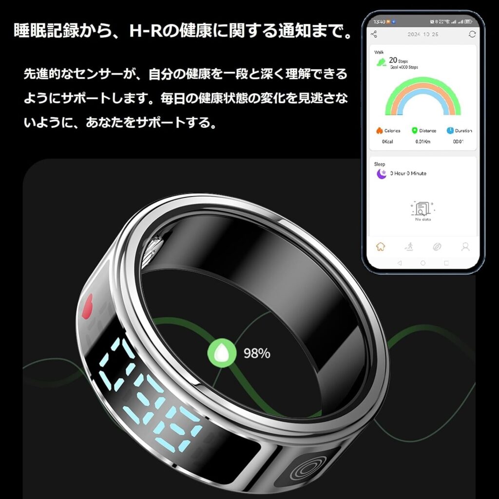 - 特徴:カスタム活動量計、ジェスチャー操作、デイリーワークアウト記録、ワイヤレス充電に対応したスマートリングです。
