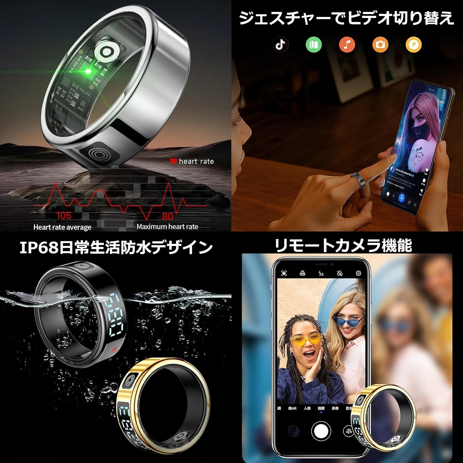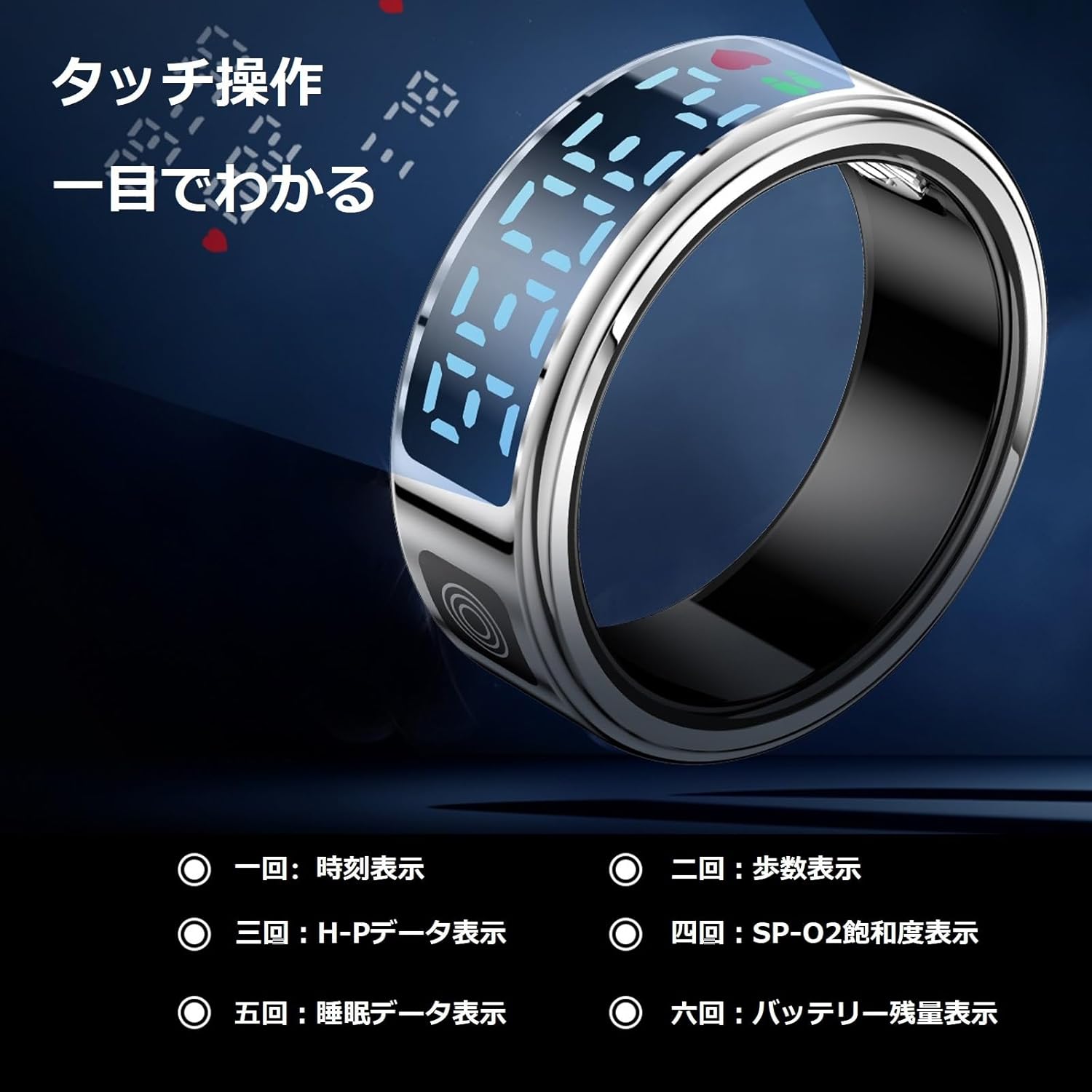 - 特徴:カスタム活動量計、ジェスチャー操作、デイリーワークアウト記録、ワイヤレス充電に対応したスマートリングです。