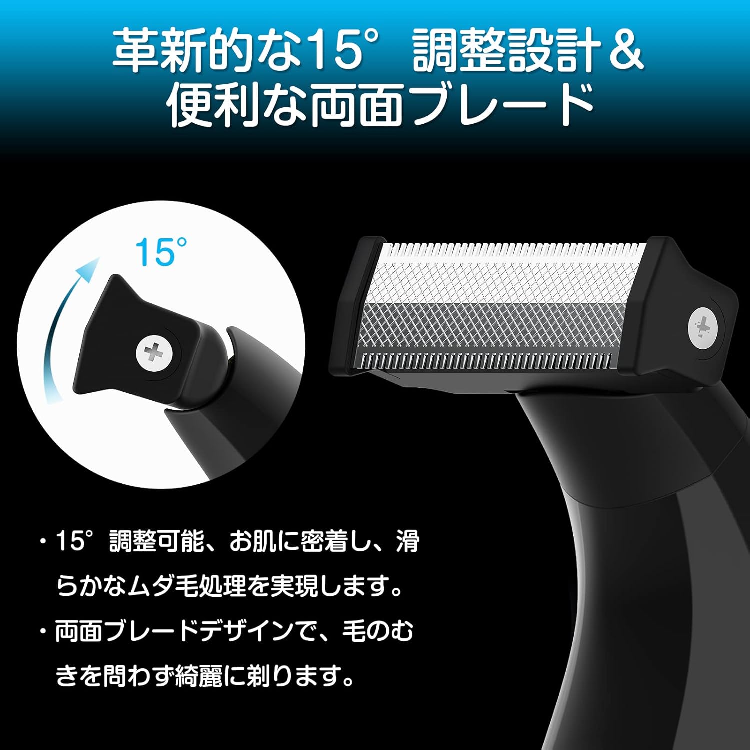 また、ヘッド部分には15度の角度調整機能が備わっています。人間の体は平面ではなく、顎のラインや脇の下など複雑な曲線で構成されています。この可動式ヘッドが肌の凹凸に追従することで、手首を無理にひねることなく、自然な動作で剃り残しを防ぐことができます。