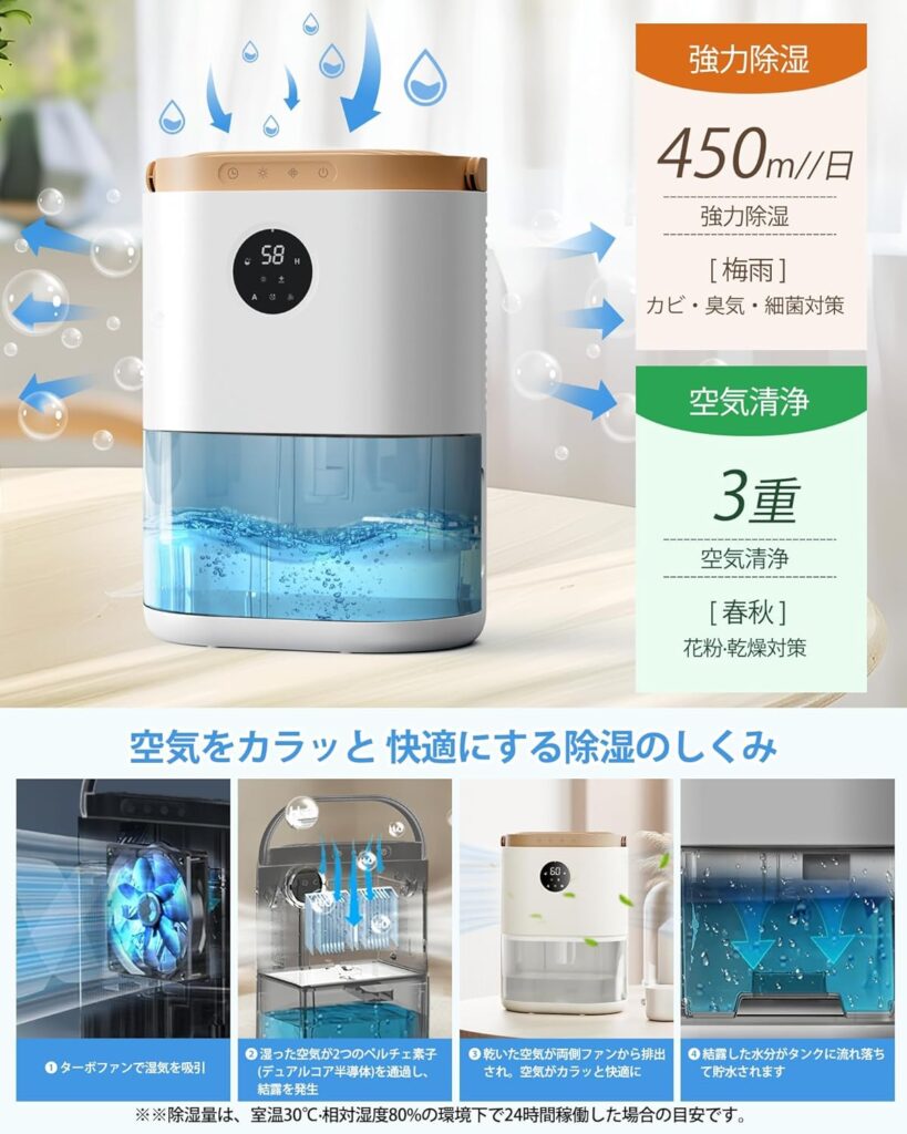 この価格帯の製品は、実は中身が似通っていることが多いです。しかし、Gegizunのモデルは「65W」という、小型機にしては比較的高めの出力を確保しています(他社は40W前後が多い)。これにより、同じペルチェ式の中でも、多少なりとも除湿スピードにおいて有利である可能性があります。