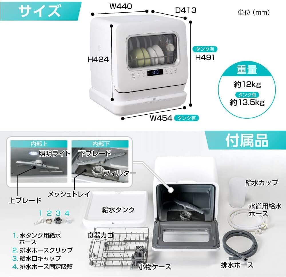 - 付属コンポーネント:取扱説明書、かご、小物入れ、排水ホース、給水ホース、水タンク、水タンク用給水ホース給水口キャップ、排水ホース用ホースバンド、排水ホース用吸盤