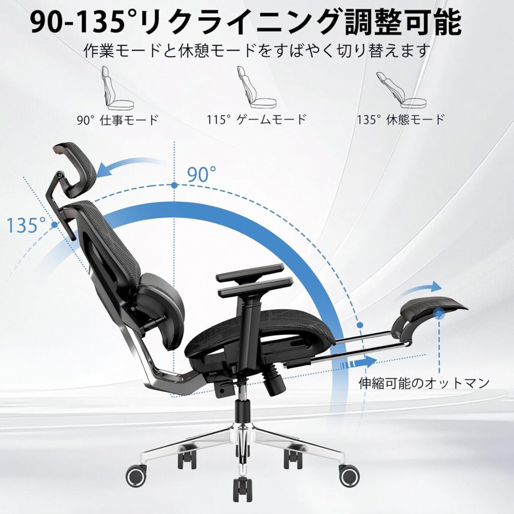 「135°まで倒せるリクライニングと収納式フットレストが最高です。昼休みに仮眠を取るとき、わざわざソファに移動しなくても椅子の上でしっかり休めるのが便利です」