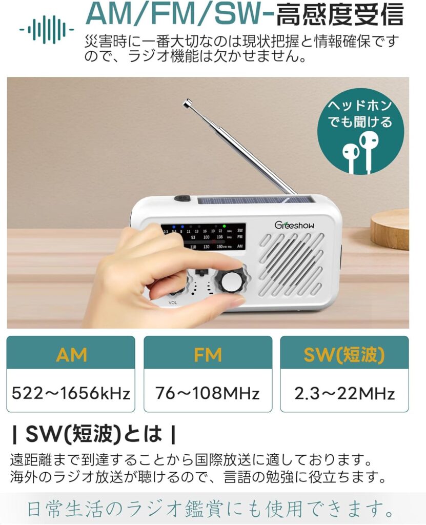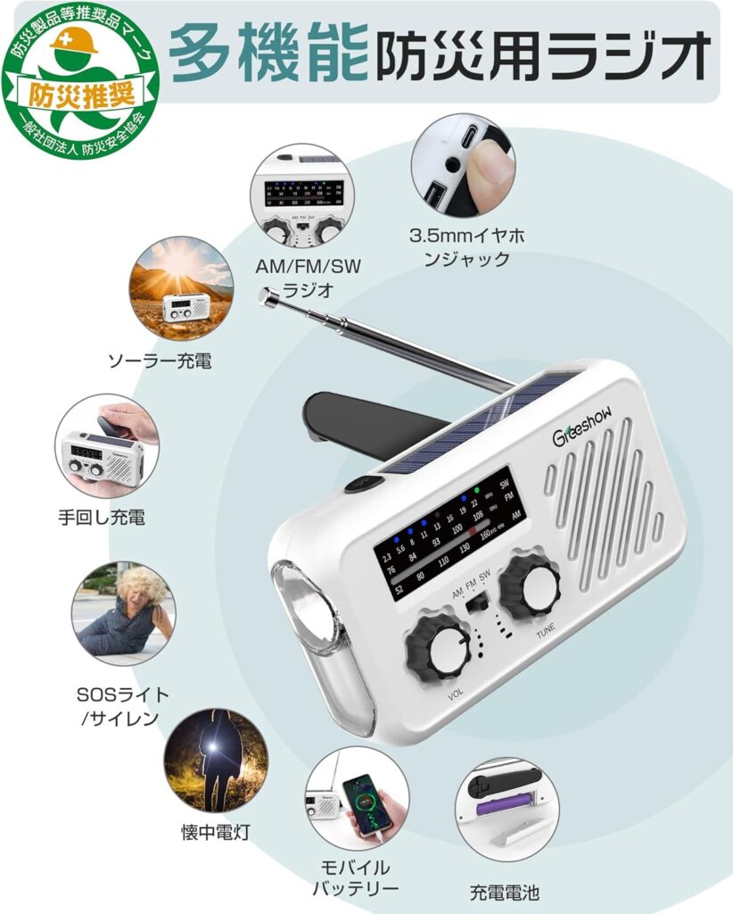 - 製品の特徴: AM/FM/SWラジオ高感度受信, 3.5mmイヤホンジャック, 懐中電灯, モバイルバッテリー, SOSライト/サイレン