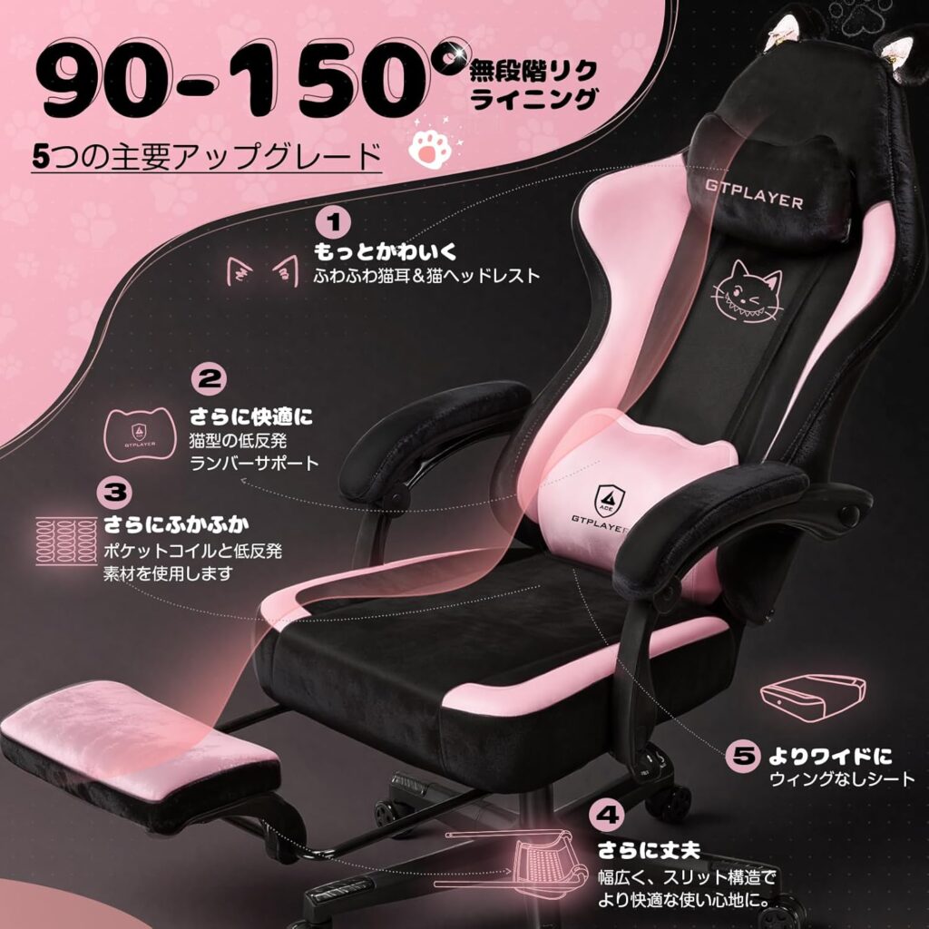 対してJP-GTP610-PINKは、ベロアの温かみ・猫モチーフ・ポケットコイル座面という「癒し」と「可愛さ」に全振りした設計で、ガチゲーマーというより「自室の時間を豊かに過ごしたい層」に最適化されています。