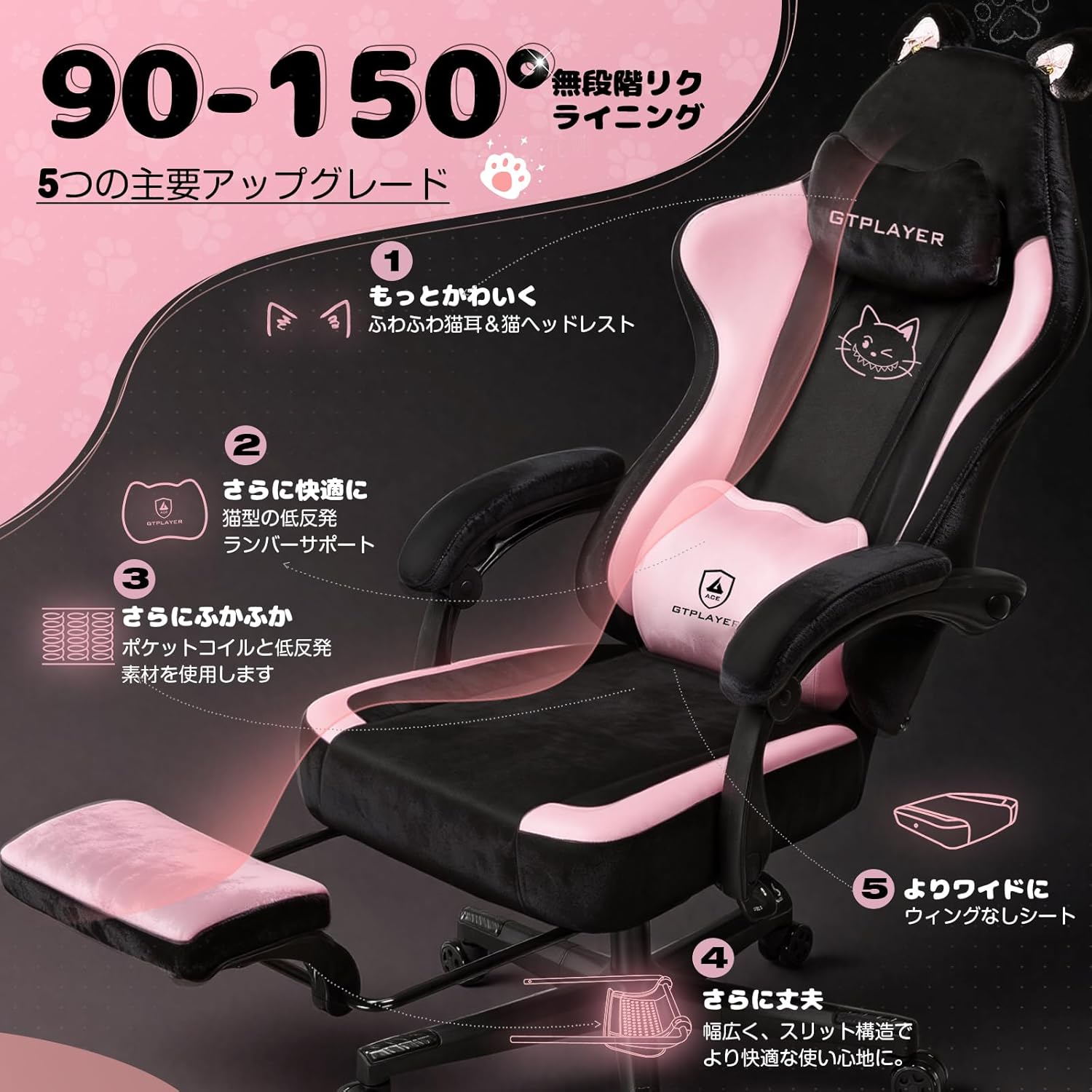そしてJP-GTP610-PINKは、キティテーマの刺繍・取り外し可能な猫耳・とろけるベロア・ポケットコイル座面が織りなす、まるで「ひざに乗った子猫」のような一脚です。
