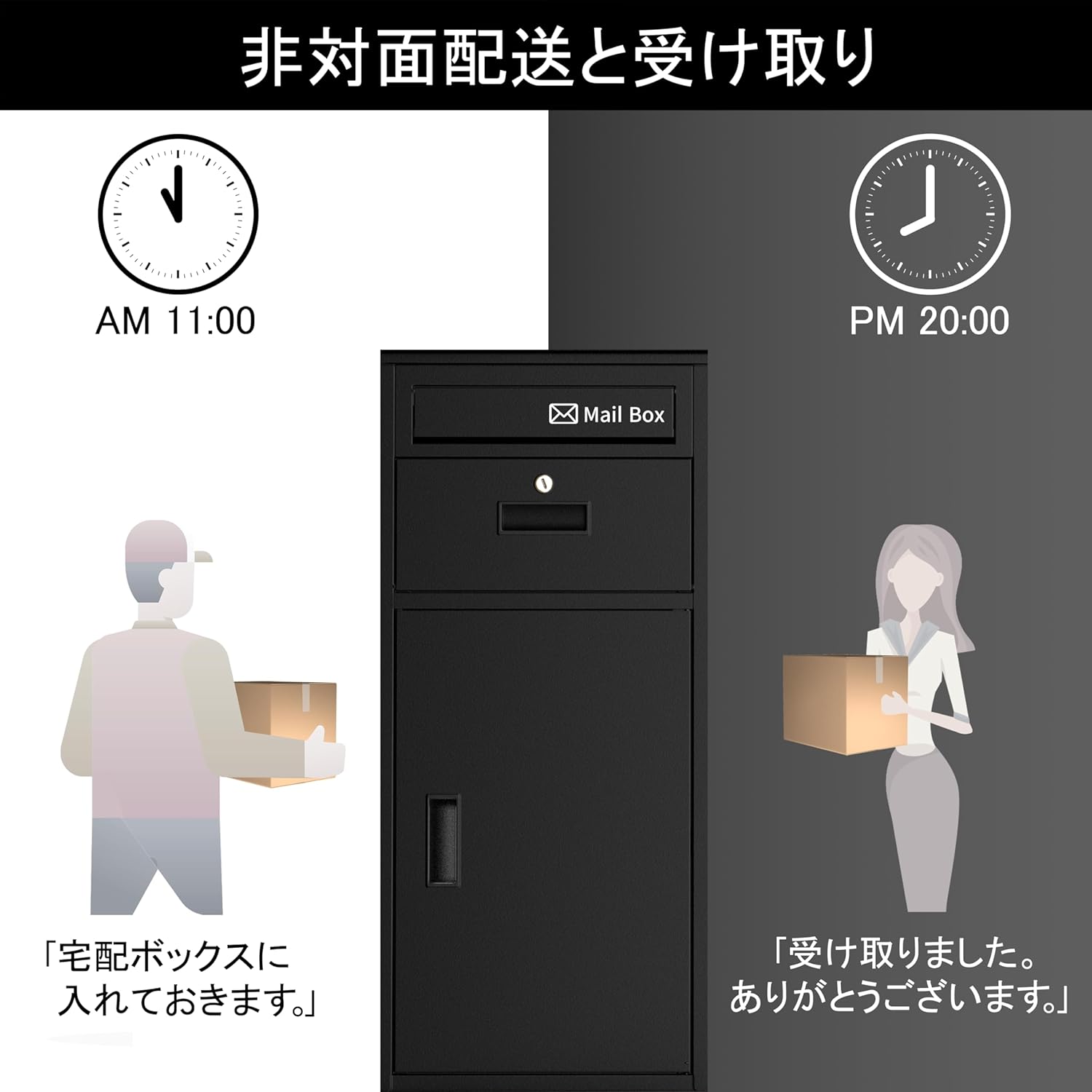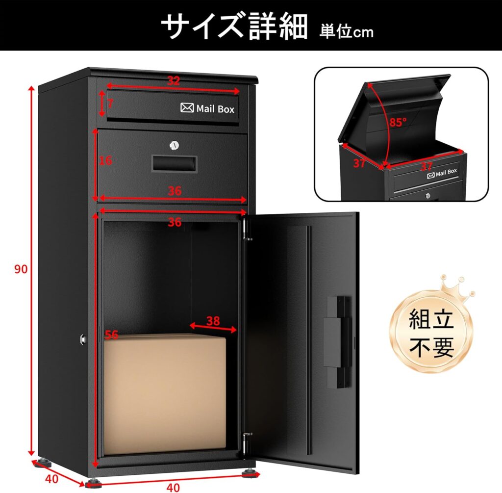 多くの宅配ボックスが「お客様組み立て」である中、本製品は「組立不要」で届く点が最大の強みです。DIYが苦手な方や、工具を持っていない方にとって、届いたその瞬間に設置が完了するのは大きなメリットです。箱から出して置くだけで、その日から再配達のない生活が始まります。