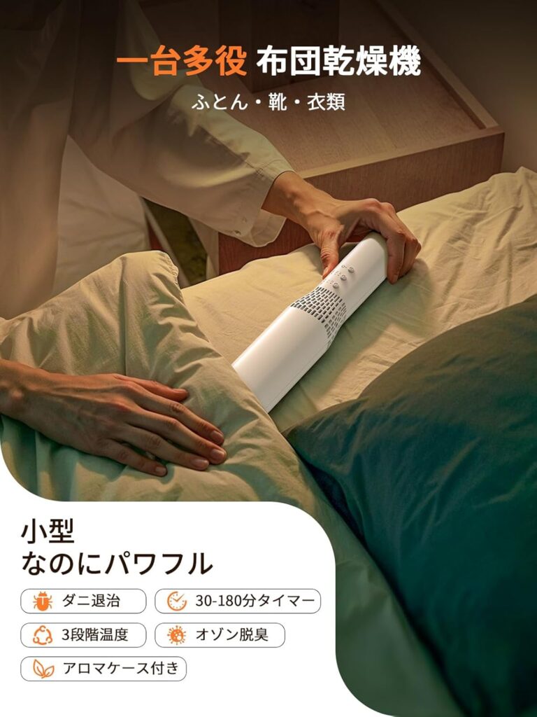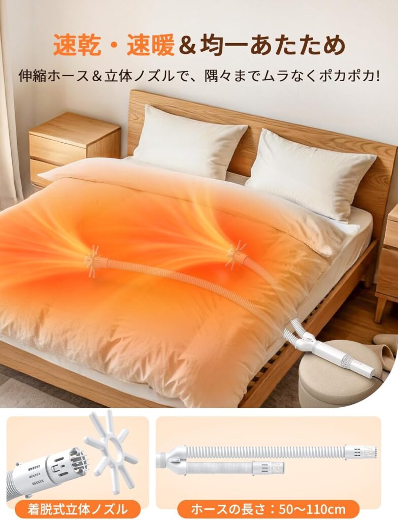 「コンパクトなのは良いですが、ダブルサイズの布団だと端まで温風が行き渡るのに時間がかかると感じました。」