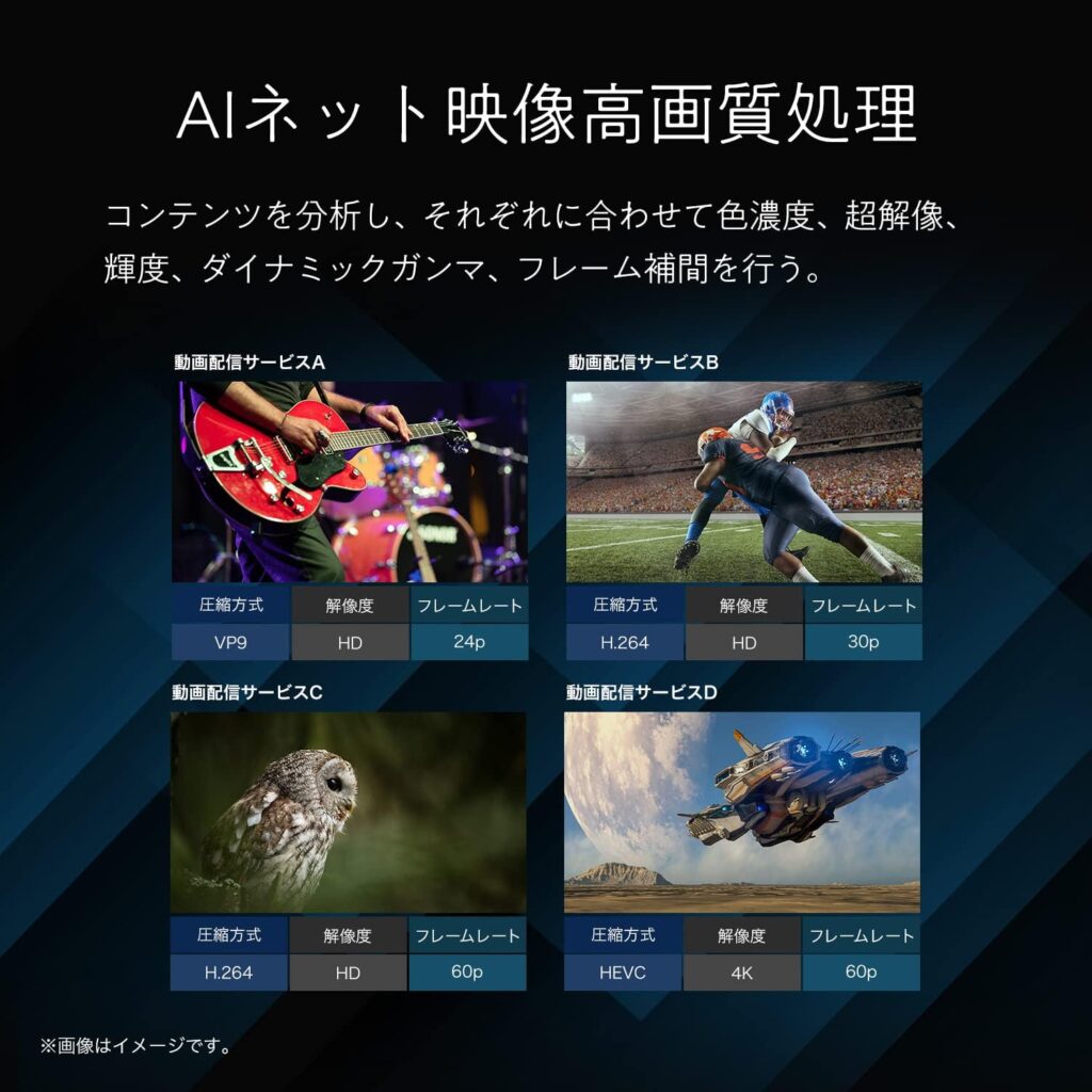 - 特徴: ドルビービジョン対応、AIネット映像高画質処理、自動画質調整、Eilex Prism音響技術、4K解像度、120Hz駆動、スマートTV機能、音声操作
