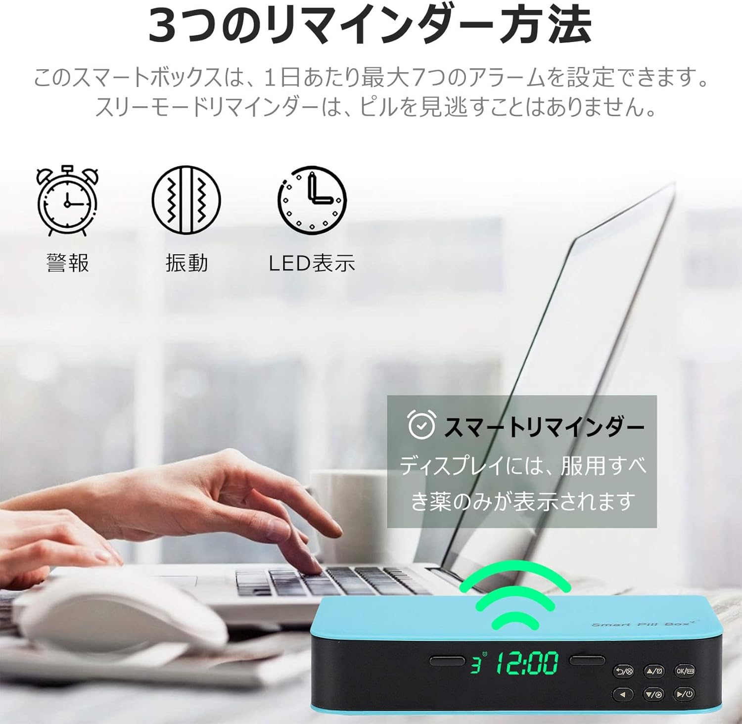 「ついつい忘れがちな昼の薬も、アラームのおかげで仕事に集中していても気づけるようになりました。」