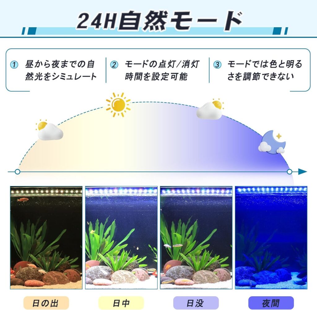 「24/7自然モードで日の出のオレンジ色から昼間のフルスペクトル・夕方の黄金色・夜間の青い月光まで自動で変化する様子は、毎日水槽を眺めるのが楽しみになる光演出です。