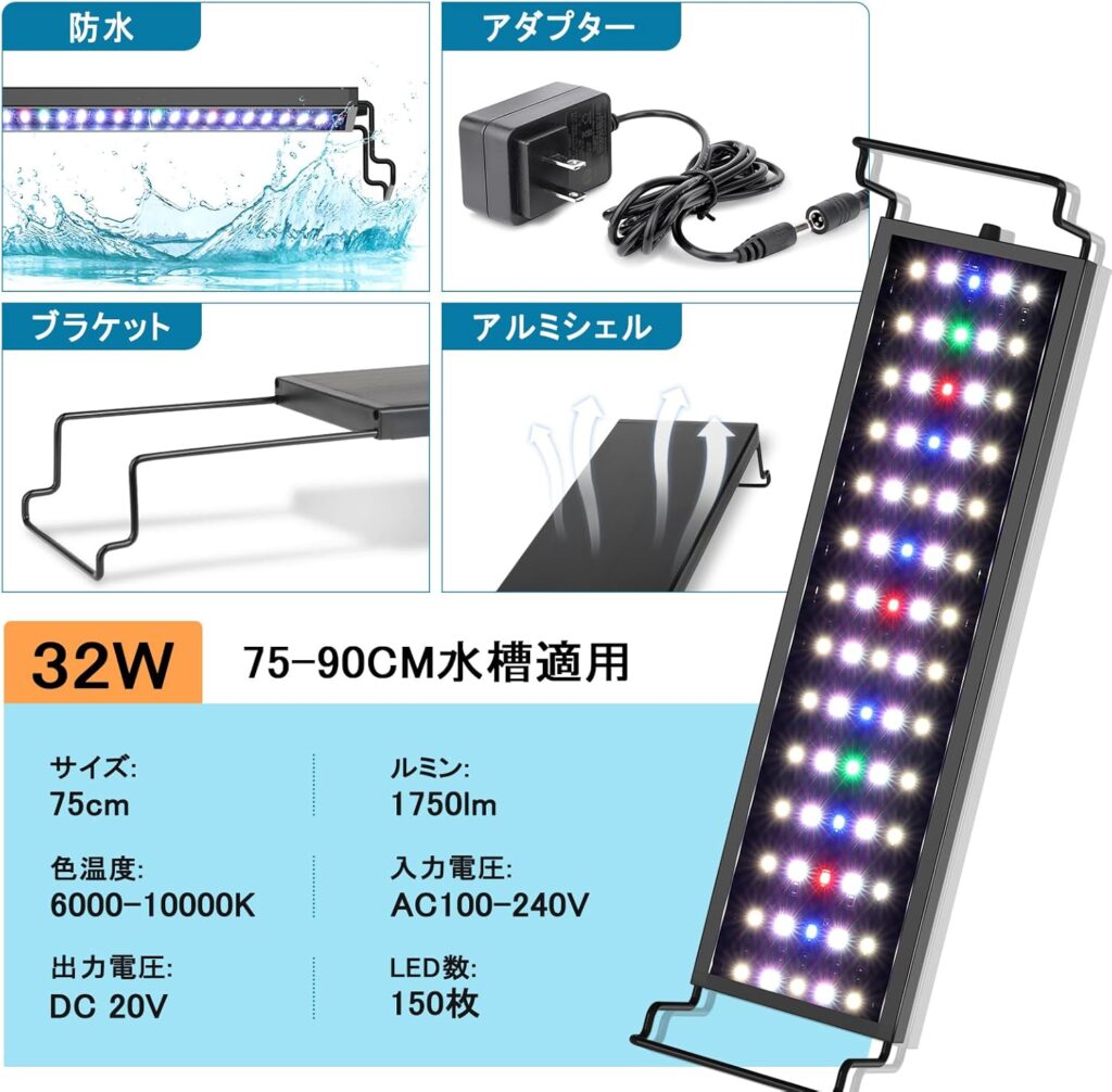 「24/7自然モード・8色調光・5段階輝度・3段階タイマー・メモリ機能・1750ルーメン・32W・伸縮式金属ブラケット・75〜90cm水槽対応」という仕様で、その照明体験に答えているのが「hygger(ハイガー)」というブランドの「hygger 水槽ライト HG075」です。