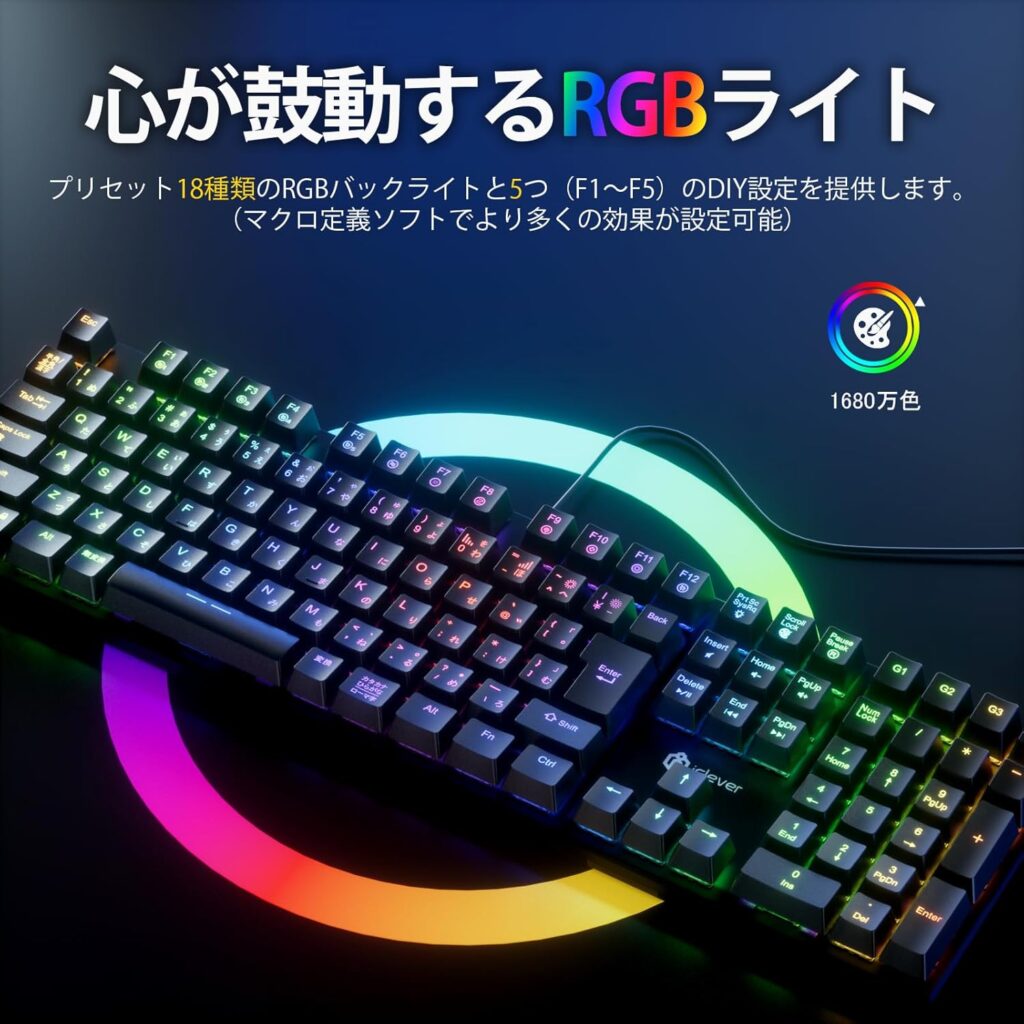 - キーボードの説明:標準JIS配列、フルサイズ、赤軸、マクロ機能、RGB、5000万回のキー寿命