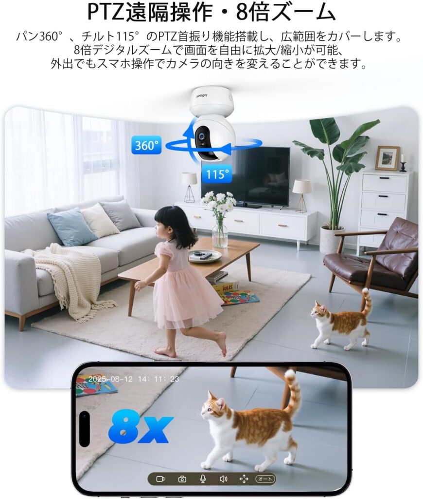 本製品の最大の強みは、屋内用見守りカメラとしては最高クラスの「4Kビデオ解像度」と「PTZ(パン・チルト・ズーム)機能」の融合にあります。従来のフルHD(200万画素)モデルでは、ズームした際に映像がぼやけてしまい、肝心な部分(赤ちゃんの表情やペットの食事量など)が見えにくいという不満がありました。