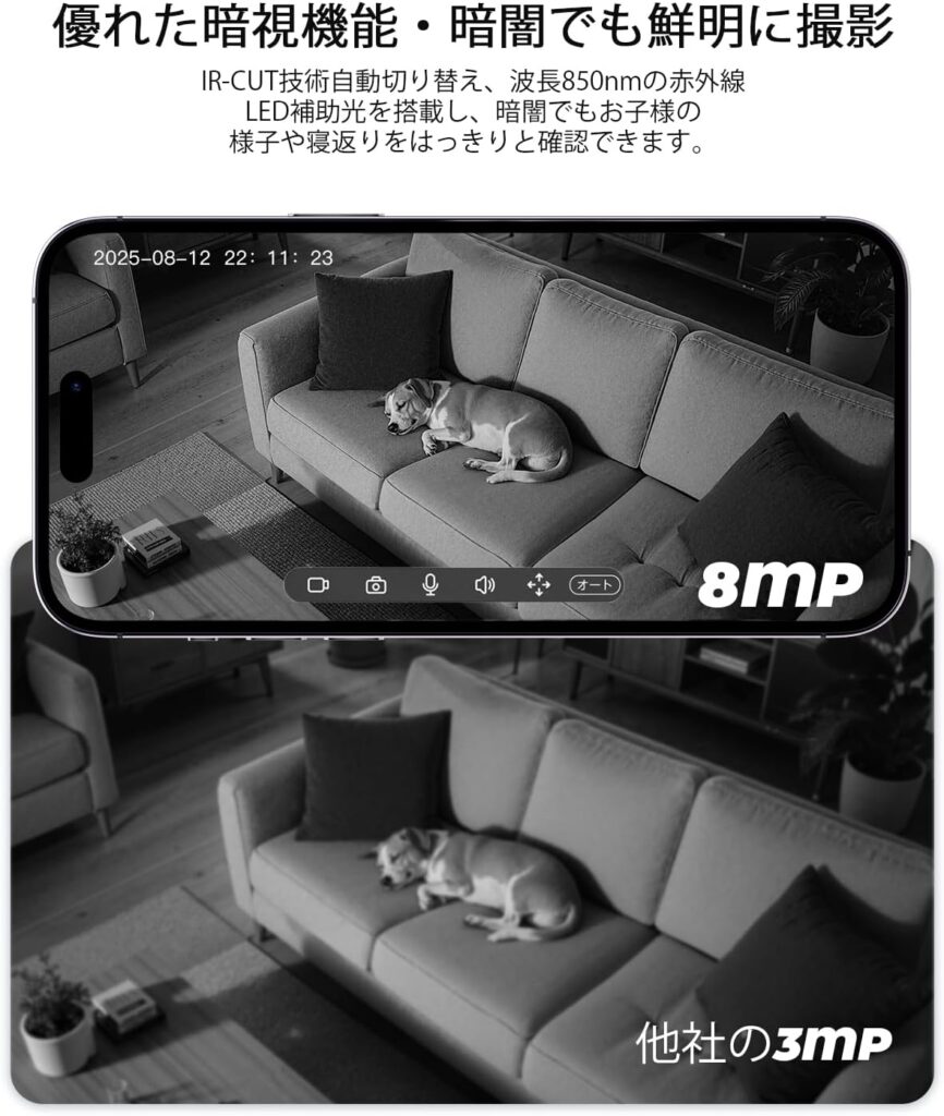 まず、最も大きな違いは「解像度」です。TP-Linkの主力モデルであるTapo C210やAnkerのEufy Security InnerCamは、一般的に2K(300万〜400万画素)を主流としています。これに対し、ieGeek 825は4K(800万画素)という圧倒的なスペックを誇ります。この差は、映像をズームした際に顕著に現れます。例えば、部屋の隅にあるケージの中にいるペットを確認したい場合、2Kではぼやけてしまう細部も、ieGeek 825なら表情まではっきりと捉えることが可能です。