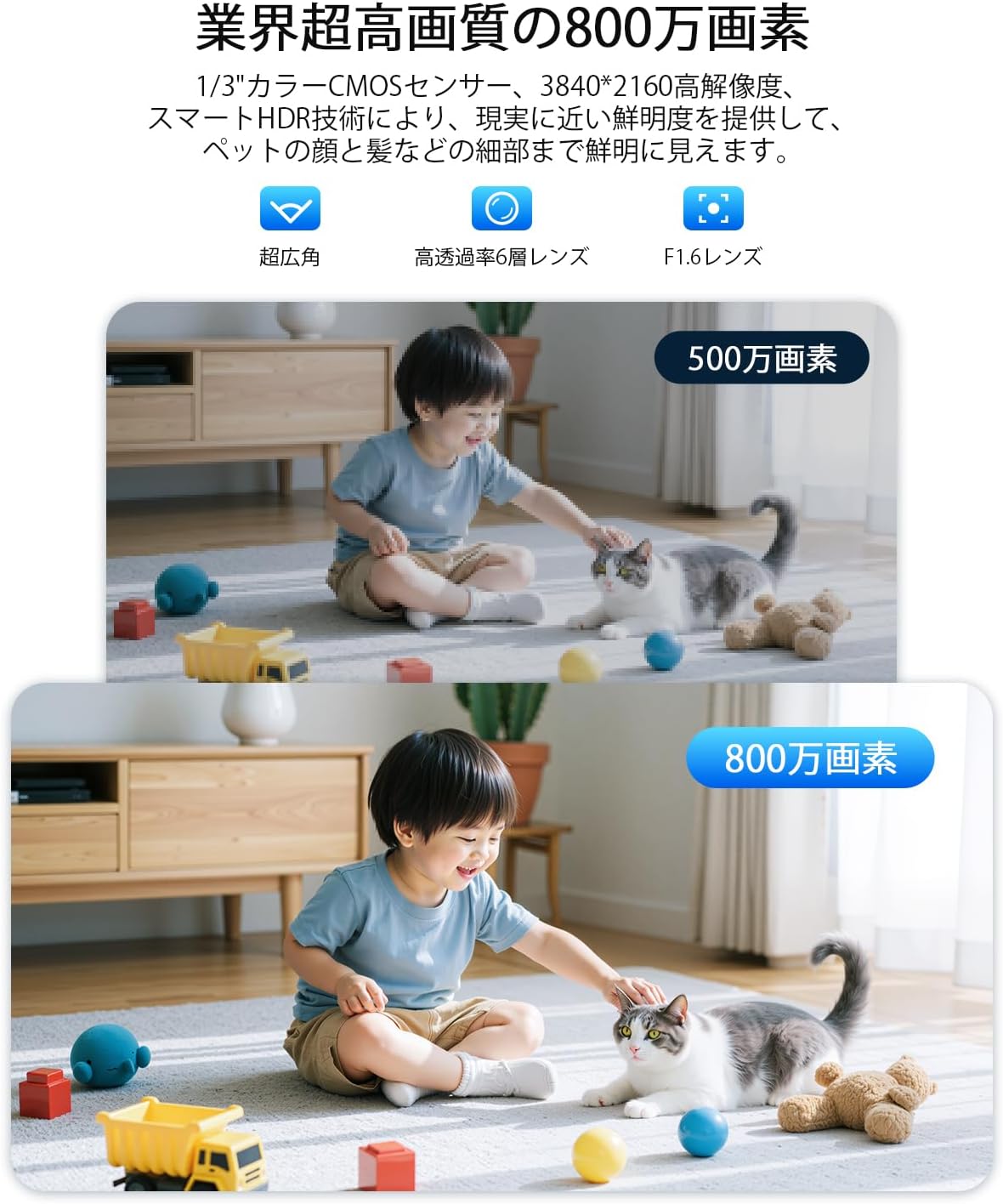 本製品の最大の強みは、屋内用見守りカメラとしては最高クラスの「4Kビデオ解像度」と「PTZ(パン・チルト・ズーム)機能」の融合にあります。従来のフルHD(200万画素)モデルでは、ズームした際に映像がぼやけてしまい、肝心な部分(赤ちゃんの表情やペットの食事量など)が見えにくいという不満がありました。