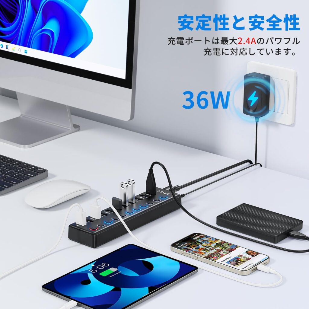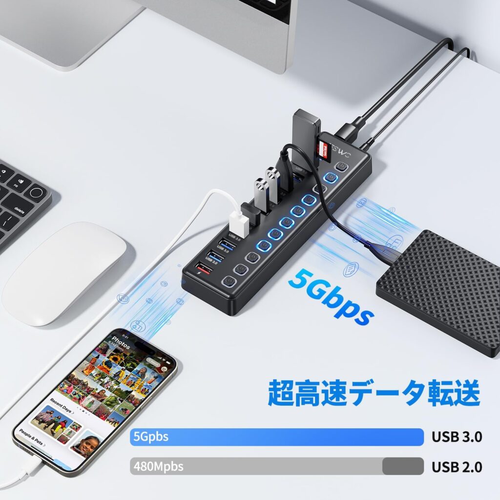 10個のUSB 3.0ポート・独立スイッチ・12V 3A電源アダプター・2.4A充電ポートという構成は、電源付きUSB-Aハブとして同価格帯で非常に実用的な内容です。