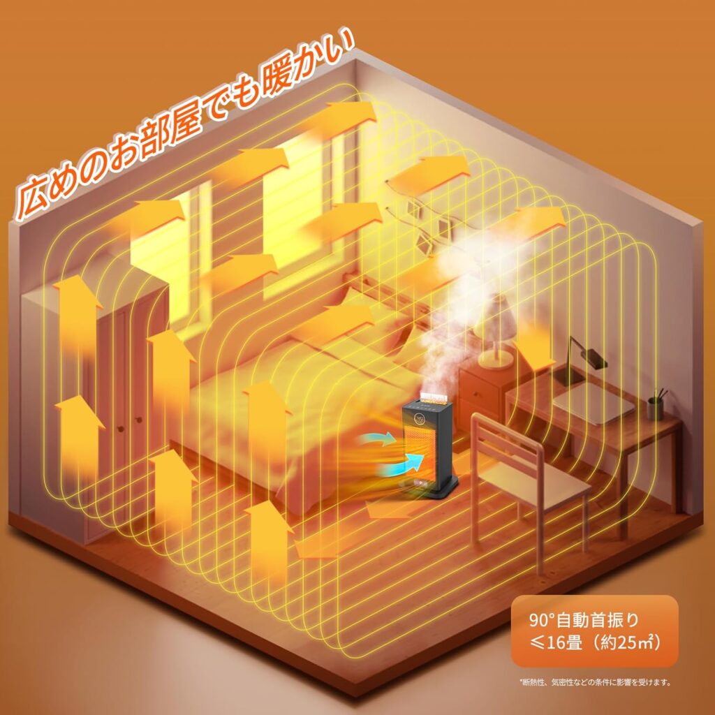また、実用面では「グラフェン技術」による1秒加熱が光ります。これは、従来のセラミックヒーターよりも熱伝導率が圧倒的に高い素材を使用することで実現したスピードです。さらに、乾燥というセラミックヒーターの最大の弱点を「超音波加湿機能」でカバーしています。加湿器を別に用意する必要がないため、省スペース化にも貢献します。これに「ECO恒温運転」や「人感センサー」といった省エネ機能を組み合わせることで、快適さと経済性を高いレベルで両立させています。