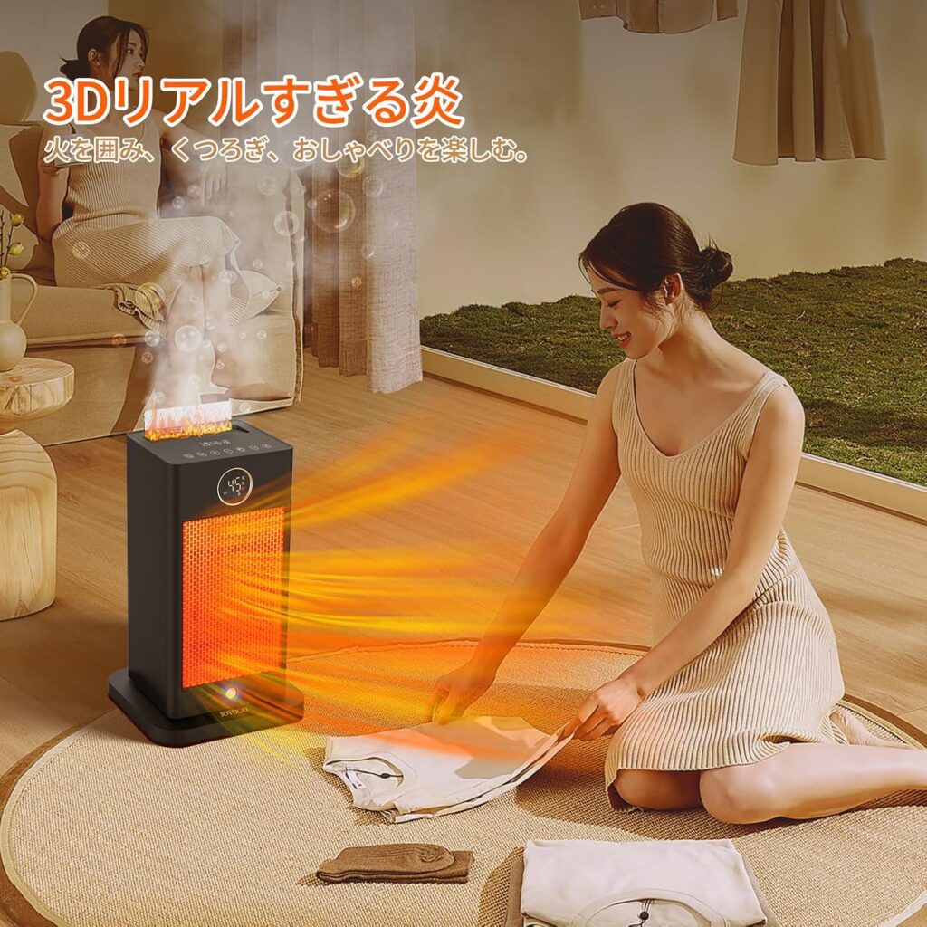 この製品の最大の魅力は、単なる暖房器具の枠を超えた「空間演出力」にあります。特筆すべきは「リアル炎」の演出機能です。視覚的な暖かさは、実際の温度以上に体感温度を上げる心理的効果があると言われています。