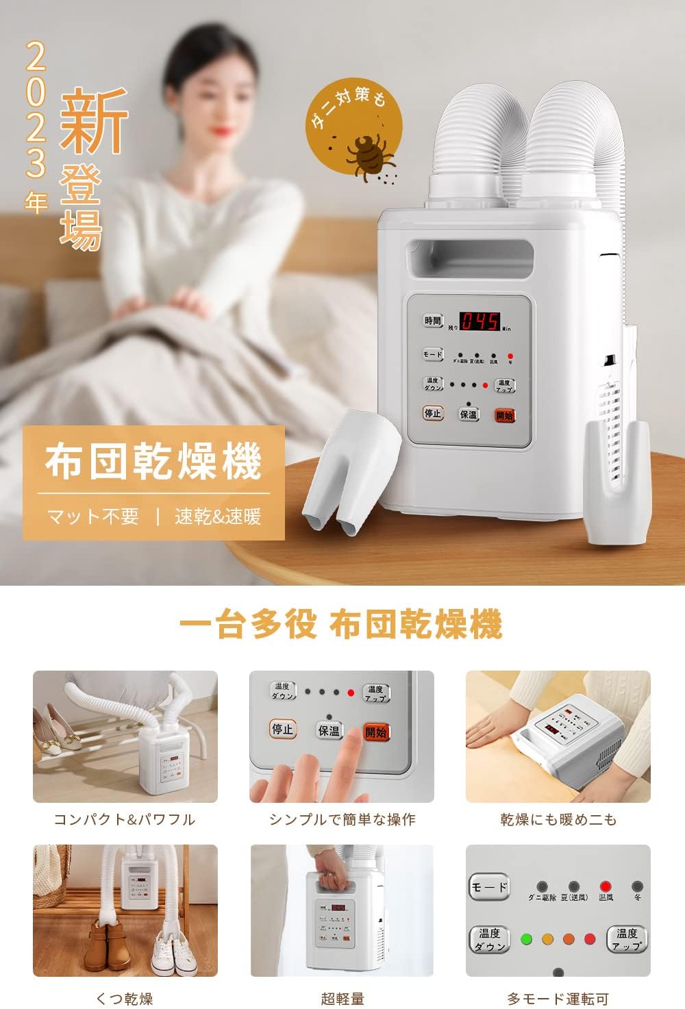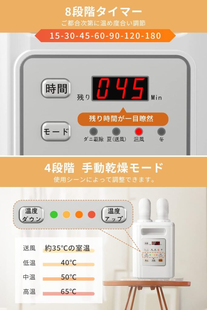 Judout NB076は「布団を温める・乾かす」という単機能に特化することでコストを下げていますが、大手高級機は「ふんわり仕上げる」「ダニを徹底的に退治する」「部屋全体の空気をケアする」といった付加価値を提供しています。
