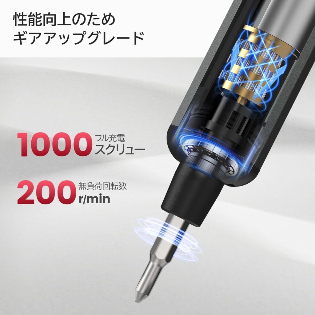 単に「ネジを回す」という行為を、「精密なオペレーション」へと昇華させています。特筆すべきは、提供スペックにある「アップグレードされたギア」と「人間工学に基づいたマグネットチップ」の融合です。従来の電動ドライバーに見られた「回転軸のブレ」を極限まで抑制し、指先とビットが一体化したかのような操作感を実現しています。また、64個ものビットを含みながら510gという重量バランスは、安定感と取り回しの良さを両立させた黄金比と言えます。グレーの洗練されたボディは、単なる工具ではなくデスク上のインテリアとしても映える完成度です。