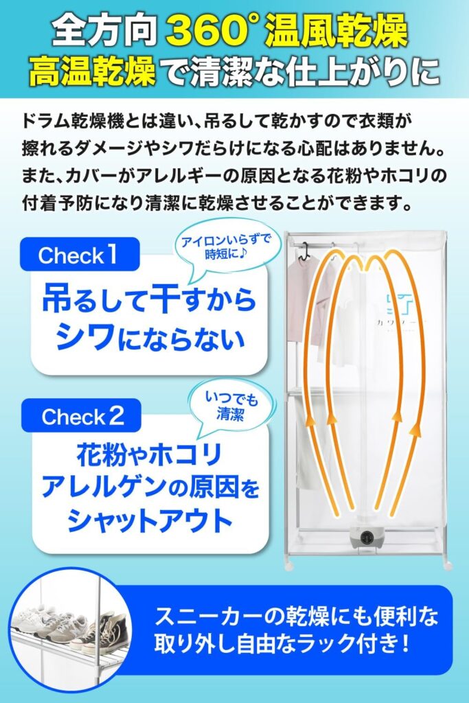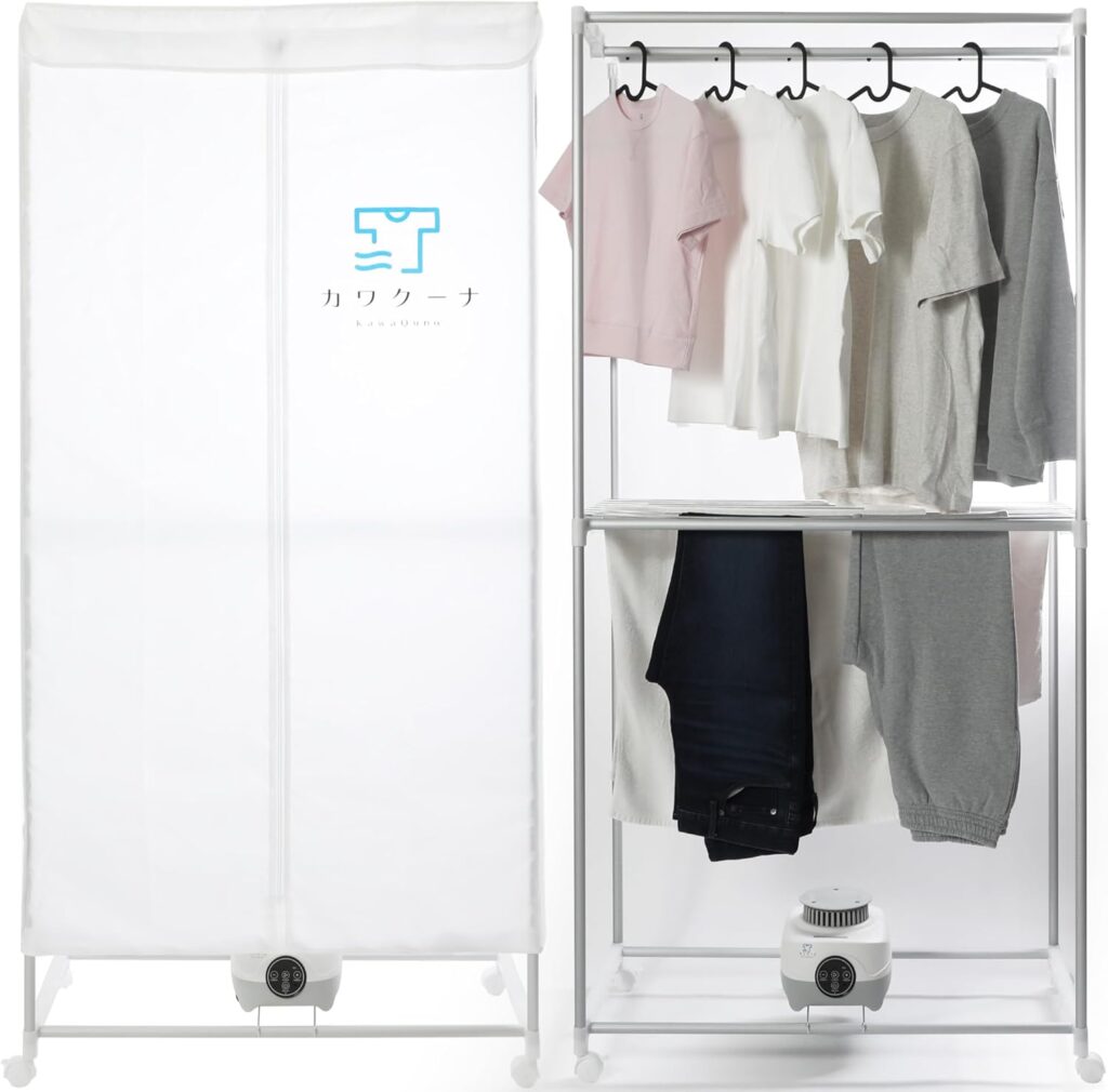 「カワクーナL」の最大の魅力は、「省スペース性」と「天候からの解放」という、日本の住宅事情と気候にマッチした明確なメリットを提供している点です。高さ180cm、幅85cm、奥行き45cmというサイズは、クローゼットや部屋の隅にも設置しやすく、洗濯機置き場に乾燥機を置くスペースがない家庭にとって救世主となり得ます。​