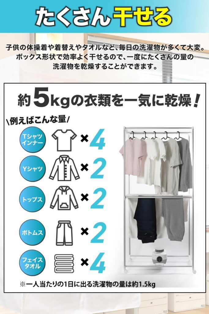 「子供の体操服や給食着など、急いで乾かしたい時に大活躍。夜にスイッチを入れれば朝には乾いているので、本当に助かります。」
