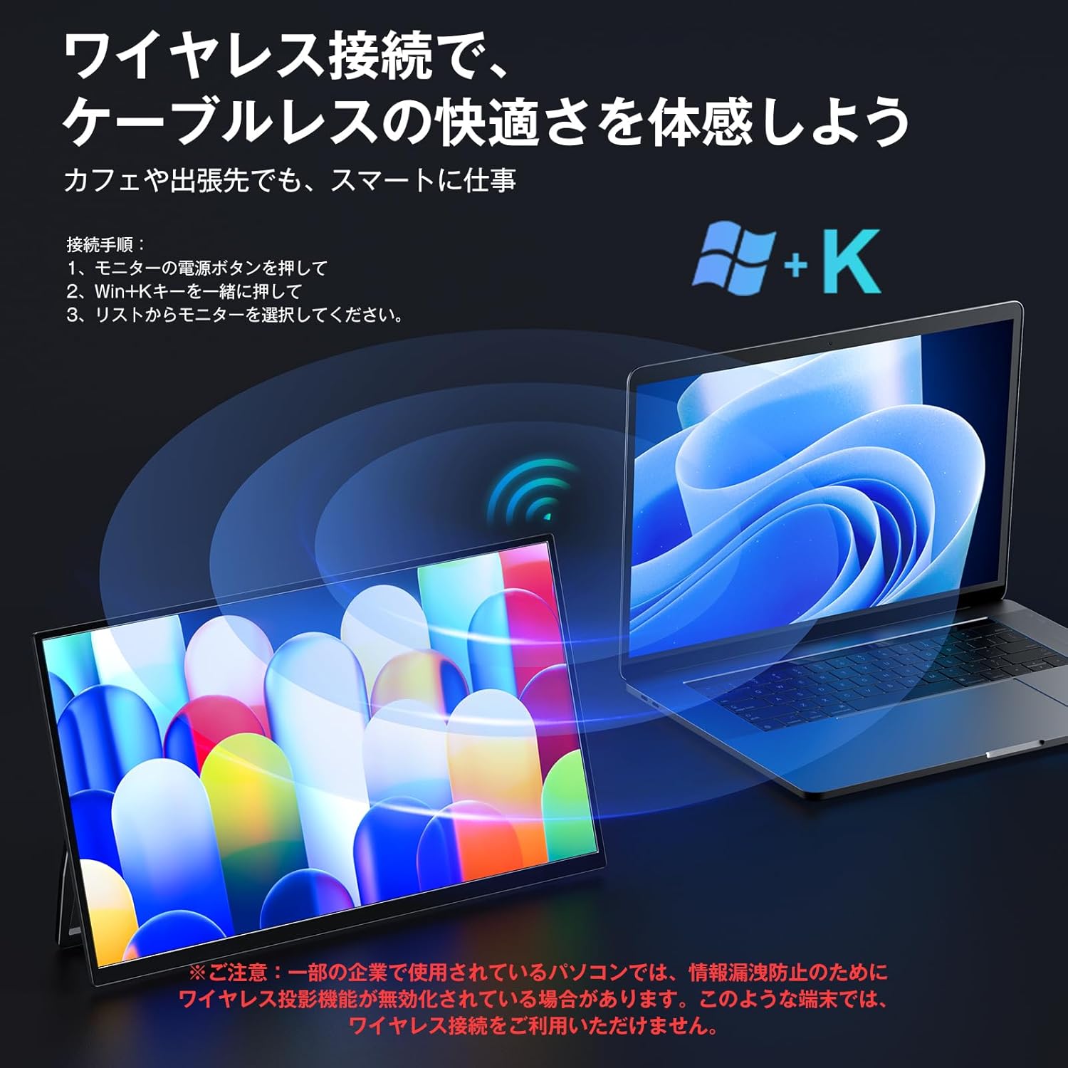P156AHBWの最大の魅力は、ワイヤレス接続機能です。MiracastやAirPlayに対応しており、Windows PC、Mac、iPhone、Androidスマートフォンなど幅広いデバイスとケーブルなしで接続できます。実際のレビューでも「遅延もほとんどなく、画面も綺麗であり、モニターとしても快適に作業できた」という評価が寄せられています。