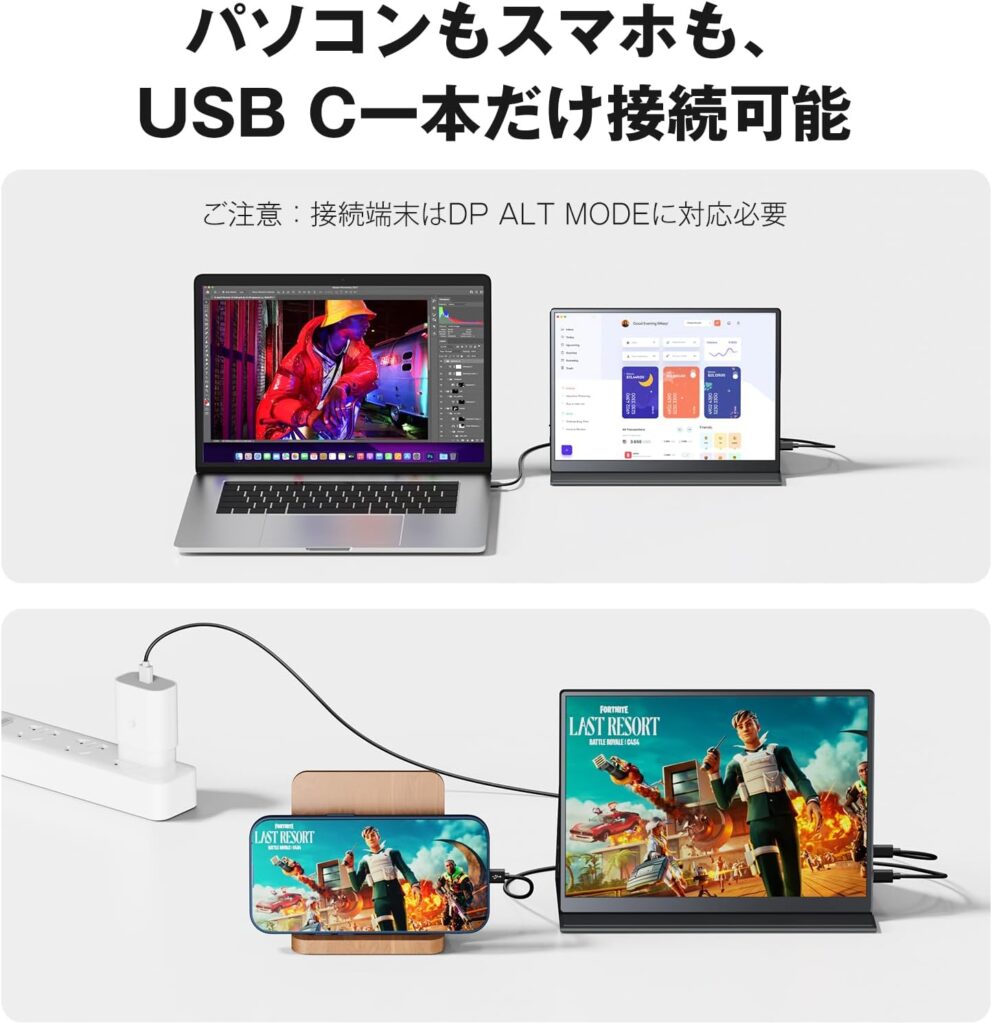 さらに、コントラスト比1500:1という数値は、同価格帯のモバイルモニター(通常は800:1〜1000:1程度)と比較しても頭一つ抜けています。黒色が白っぽく浮くことなく、引き締まった映像表現が可能であり、作業だけでなくエンターテインメント用途でも高い満足度が得られる仕様です。