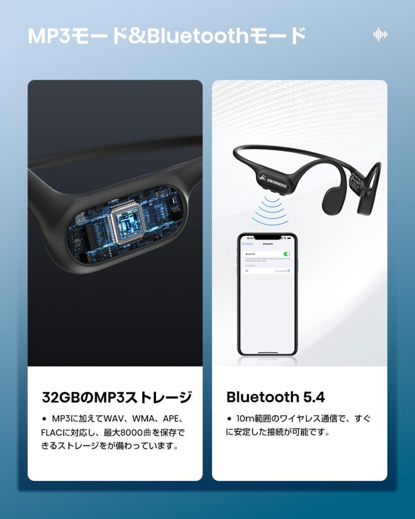 従来の骨伝導イヤホンが、せいぜい「雨をしのげる傘」程度の防水性だったのに対し、S18は「本格的な潜水艦」にも例えられるIP68という強靭なシールドを手に入れました。さらに、32GBの内蔵メモリは、重いスマートフォンを置き去りにして、音楽という名の「必需品」だけを身軽に持ち出す自由を提供してくれます。