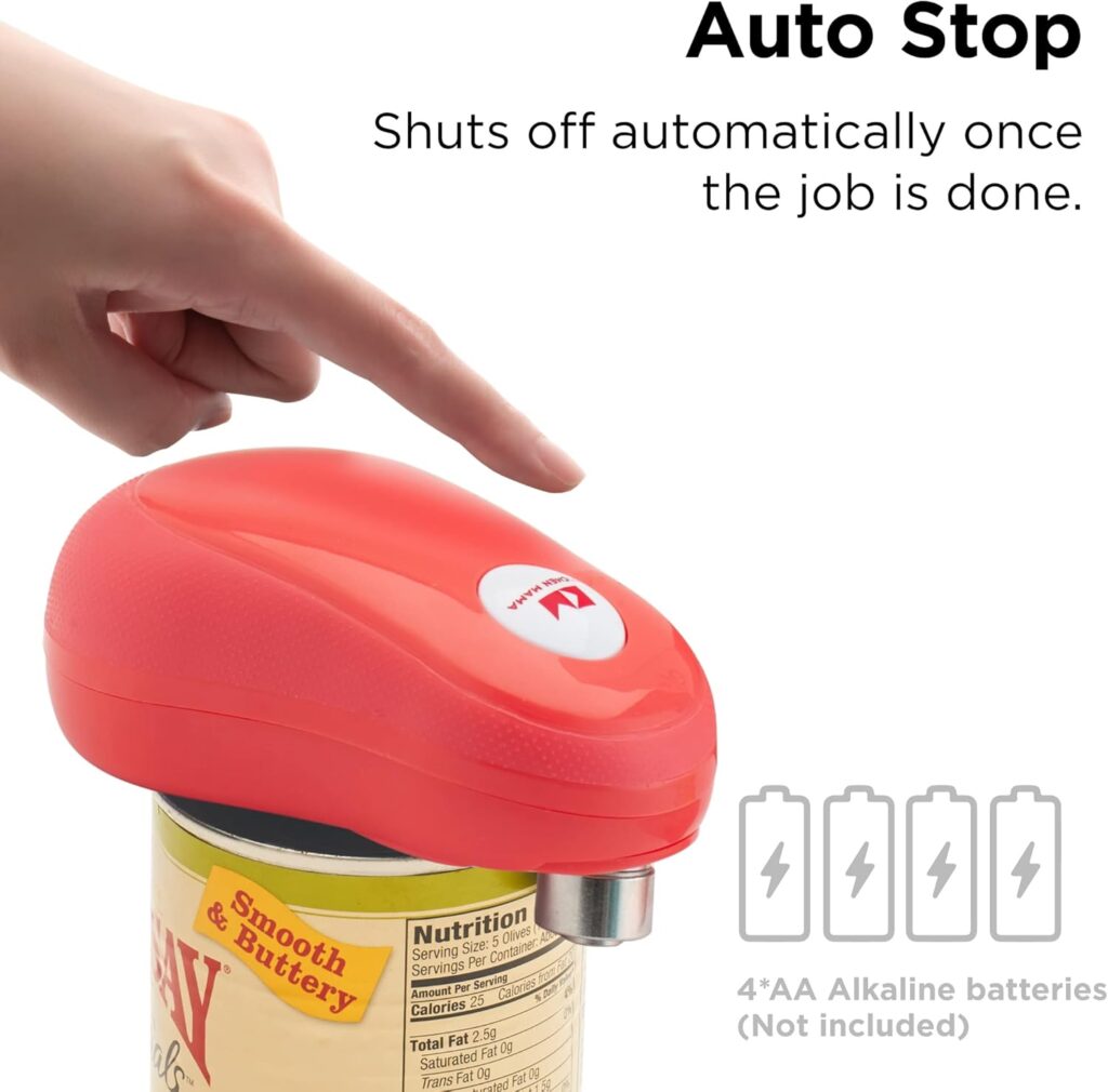 最も一般的な手動式の缶切りと比較した場合、最大の違いは「身体的負荷」と「安全性」です。手動式、特に安価なバタフライ型は、缶の縁に刃を食い込ませる際に強い握力を必要とし、さらにハンドルを回す動作は手首に負担をかけます。これに対し、Kitchen Mamaはボタンをワンプッシュするだけで全自動です。