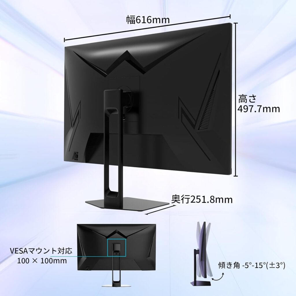 接続端子もHDMI2.0×2とDisplayPort1.4×1を備えているため、ゲーミングPCに加えて家庭用ゲーム機やノートPCを常時接続しておける余裕があります。VESAマウント対応によりモニターアームに取り付ければ、デスクの奥行きや高さを柔軟に調整でき、マルチモニター環境への発展もスムーズです。