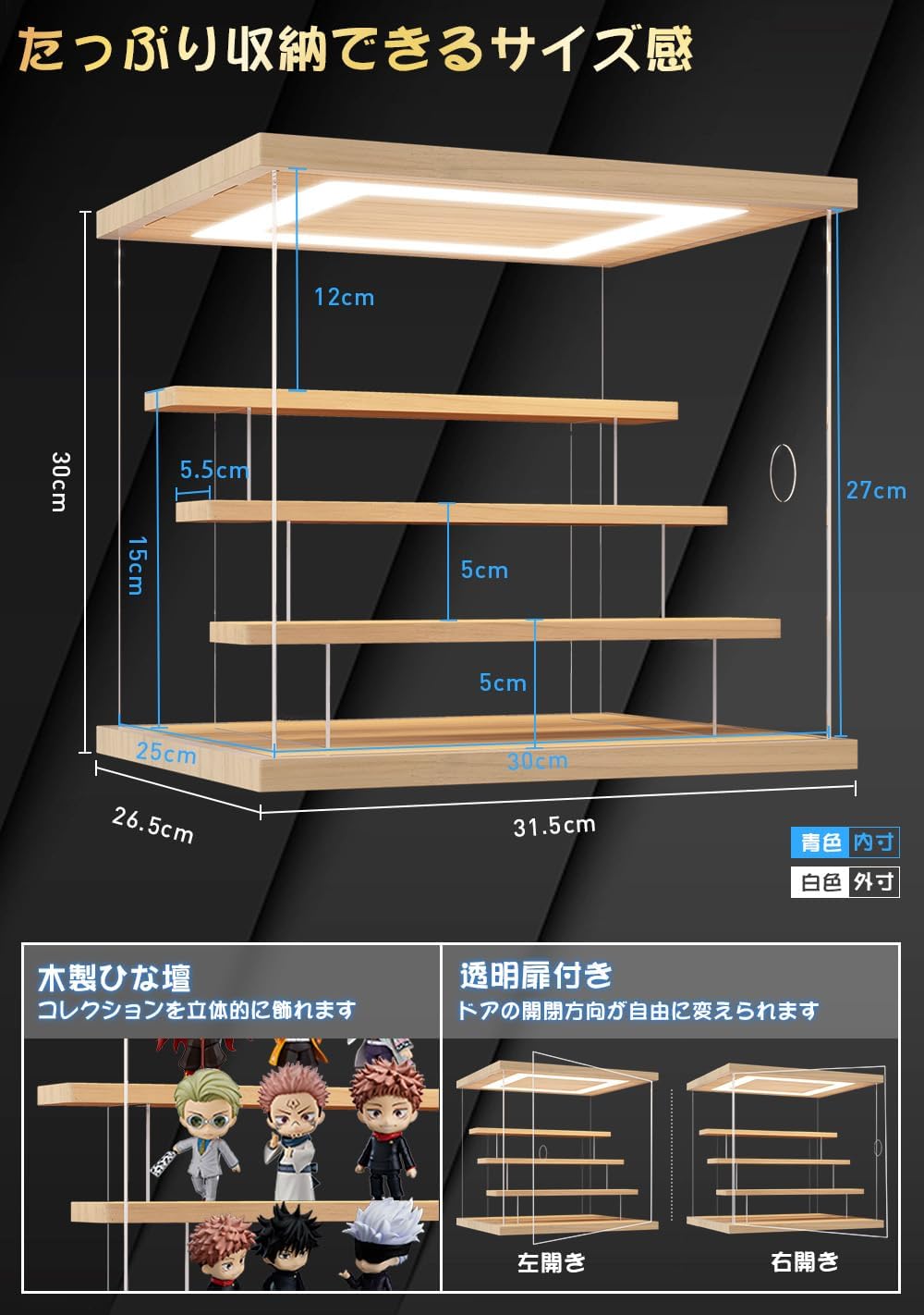 • 【商品仕様】サイズ:幅30cm × 奥行18cm × 高さ25cm(3段式)。素材:天井板はオーク集成材、側面板(透明)はアクリル板、サイドパーツはアクリル板、台座・ひな壇はオーク集成材。用途:フィギュアケース、コレクションケース、アクリルケース、模型ケース、ディスプレイケース、人形ケース、展示用ケースとして使用可能です。