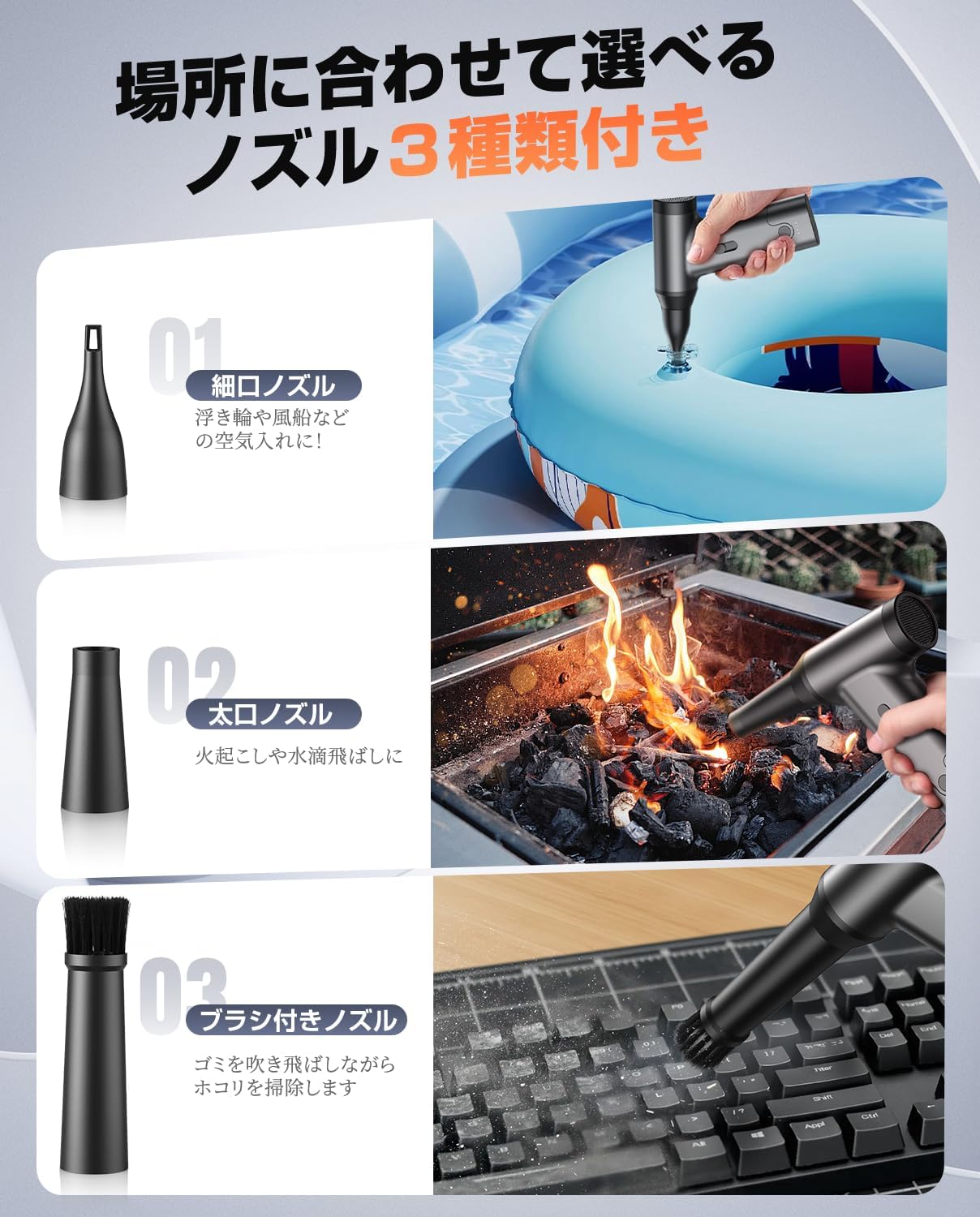「豊富なノズルが付属していて、特にブラシ付きノズルは細かいチリを掻き出しながら吹き飛ばせて、プロの掃除道具みたいで感動しました。」
