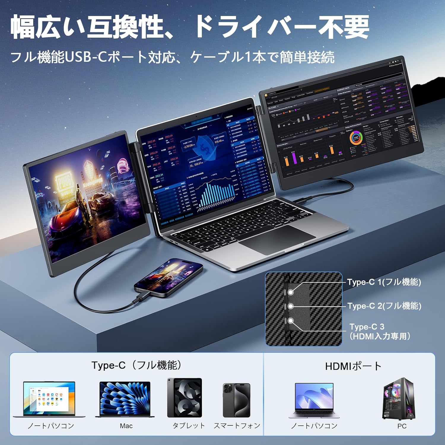 - 接続方式:プラグアンドプレイ設計、フル機能のType-Cポート1つで動作可能