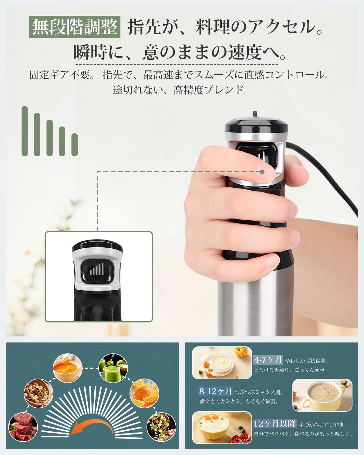 従来の2段階や5段階といった段階式の調節とは異なり、指先の力加減一つで無限に近い速度コントロールができるため、食材の状態や仕上げたいテクスチャーに応じた繊細な調理が可能になります。