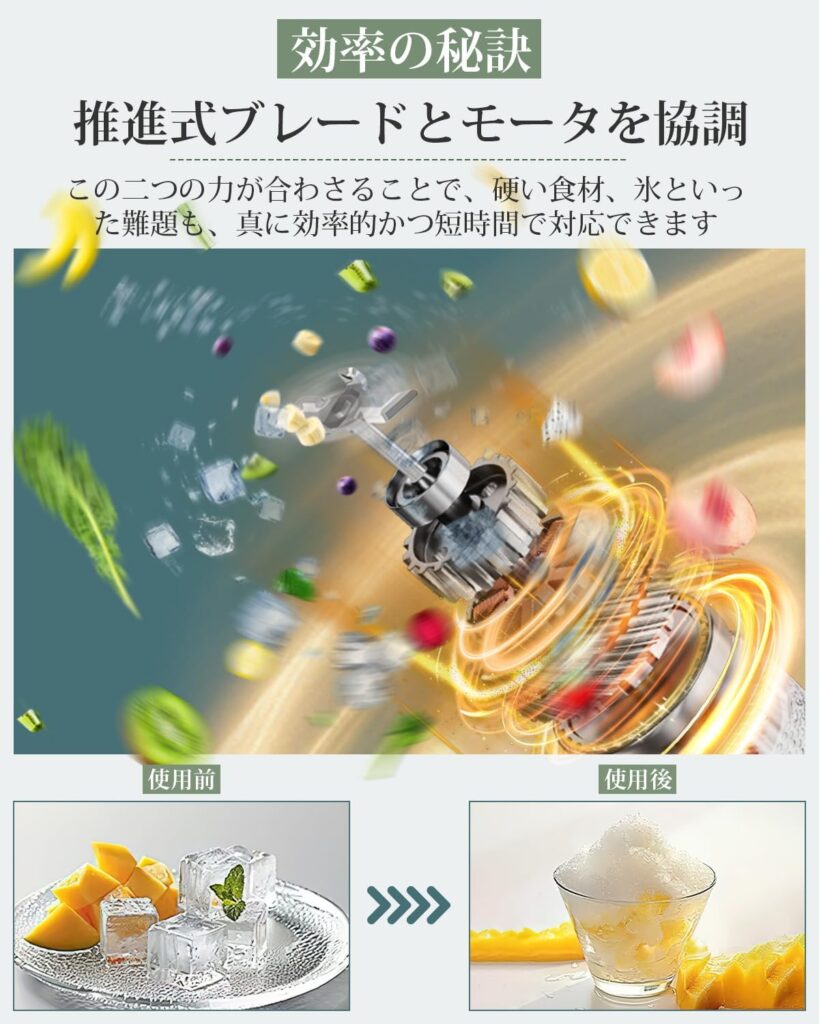 さらに、推進式刃の採用により、硬い氷やナッツ、繊維質の多い野菜などもスムーズに粉砕でき、詰まりにくい構造になっているため、毎日の調理が驚くほど快適になります。