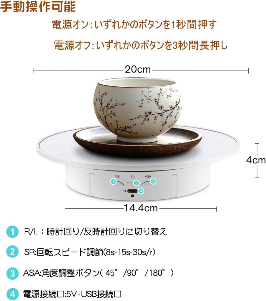 - 付属品:USBケーブル1, リモコン1, 日本語取扱説明書1, 電動回転台1
