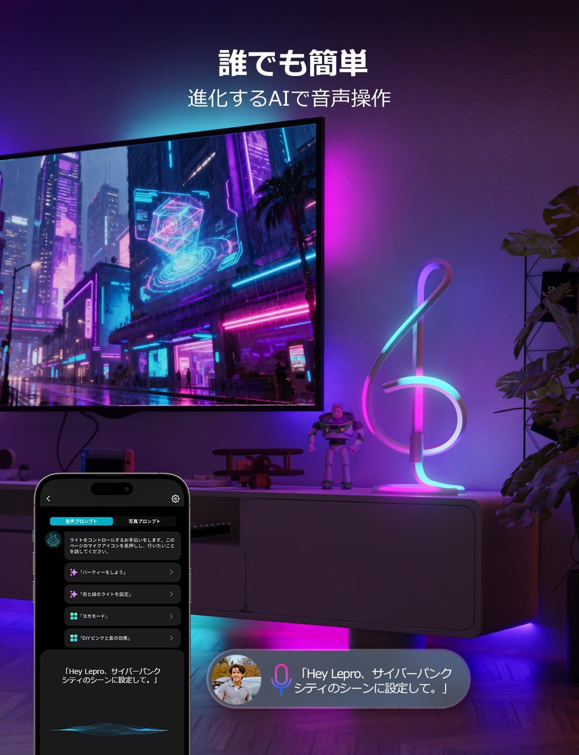 一方、Lepro TB2-JPはAIによる照明効果の自動生成と学習機能という、Goveeにはない独自のアプローチが最大の差別化ポイントです。 画像認識や音声によるシーン生成はLepro独自のLightGPM技術であり、プリセットに頼らない「創造的な照明体験」を求めるユーザーにはTB2-JPに軍配が上がります。 デザイン面でも、TB2-JPの高音記号モチーフはGoveeのシンプルなランプ形状とは明確に異なり、インテリアとしての存在感は一段上です。