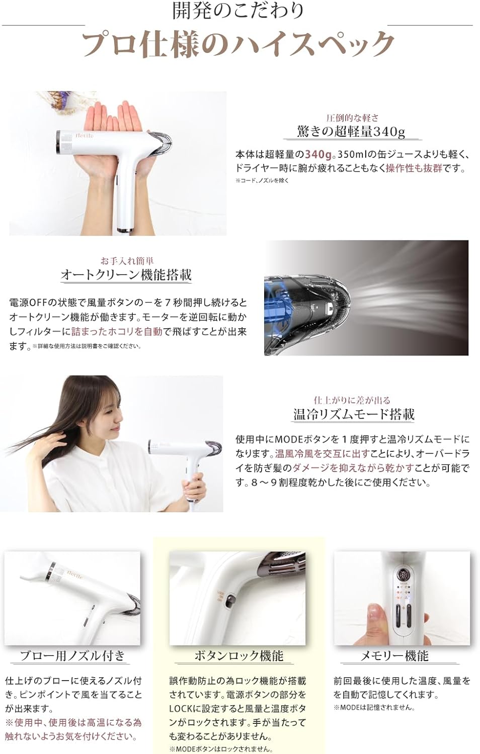 - 【こだわりのハイスペック】:驚きの軽さ超軽量350g、温冷リズムモード、オートクリーン機能、メモリー機能、ロック機能、等最高級ドライヤー以上の機能を備えたハイスペックドライヤー。
